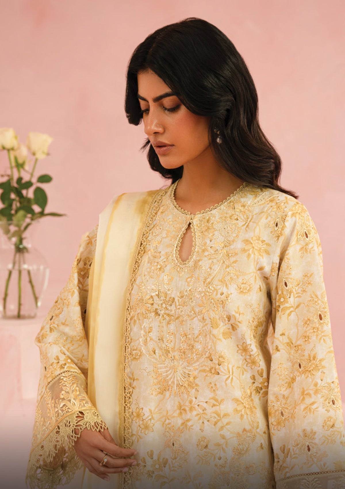 This skin-toned lawn dress exudes classic appeal with sleek embroidery and organza accents for a refined touch. Paired with an artistically printed silk dupatta and coordinating plain pants, it offers effortless elegance.