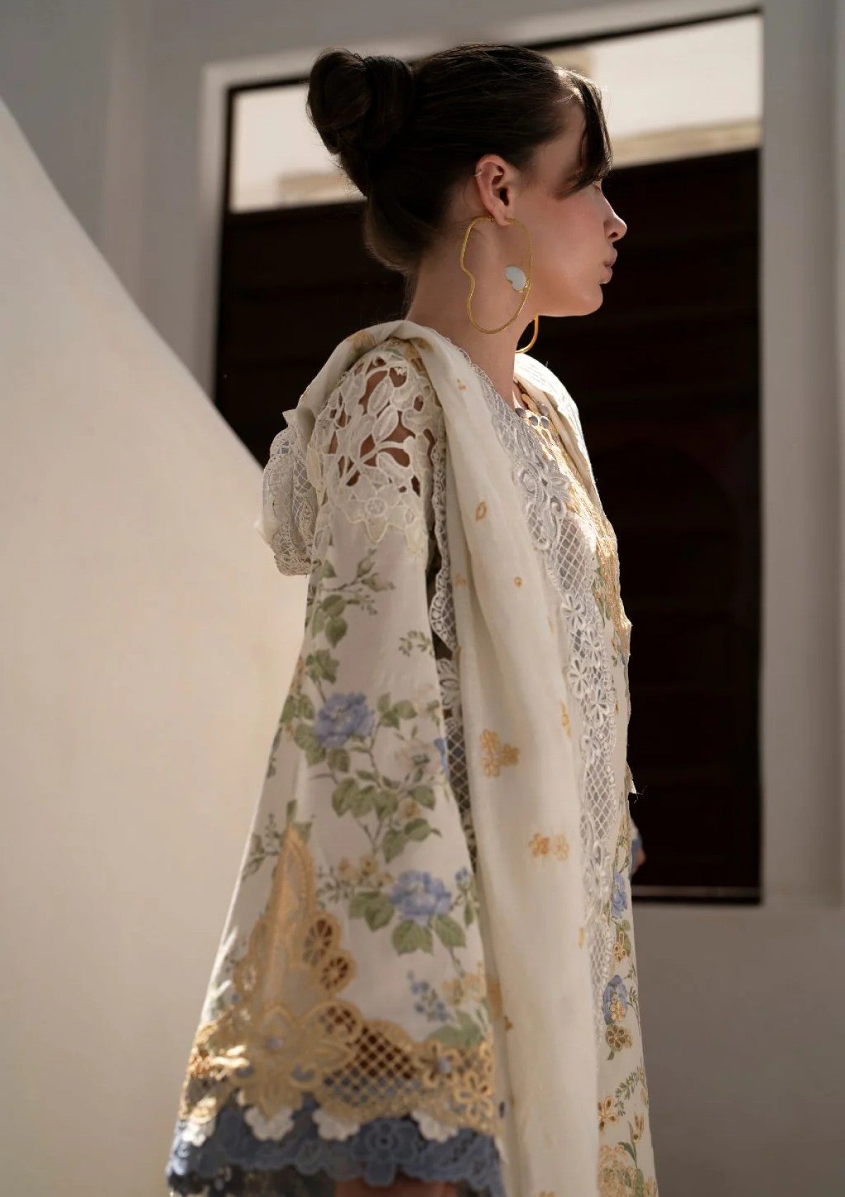 Step into a world of sunshine and delicate blooms âÃÂàsay hello to MazeâÃÂÃÂïøàThe pretty beige floral base, awash in yellows, periwinkle, and sage, is instantly uplifting. But the magic truly begins with the yellow resham chikankari embroidery that dances across the front, enhancing the print with such delicate texture. And the daman? Oh, the daman! Composed motifs in an organza appliquÃÂé style are a true statement, beautifully framed by a thoughtfully designed lace border that graces both front and back. Even the sleeves whisper elegance with a single yellow resham thread border. Paired with dyed trousers and a Monark fabric dupatta embroidered with an all-over sprat petal design and a stunning 4-sided cutwork embroidered border âÃÂàSunbeam is pure artistry, designed to brighten your day.