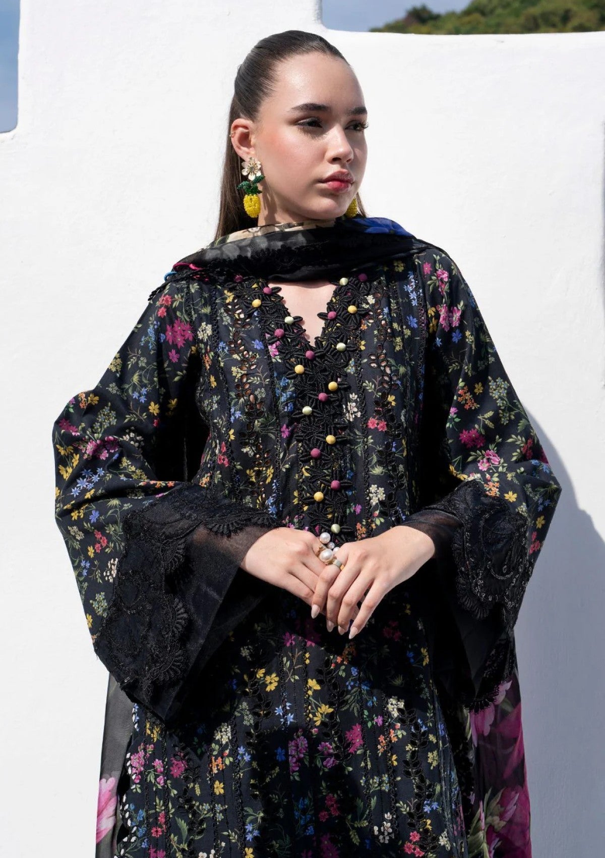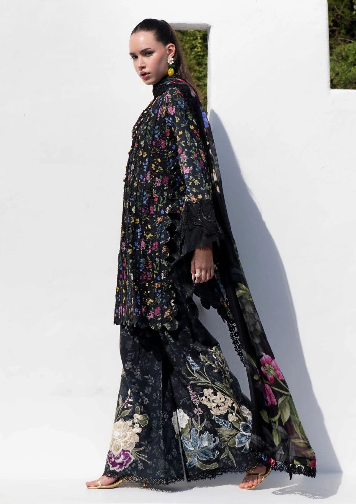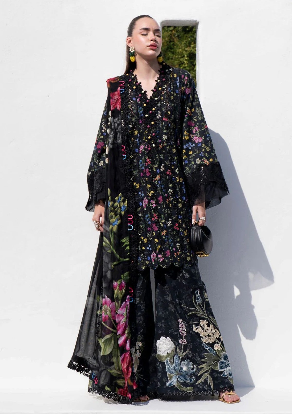 Unveiling the drama you've been waiting for âÃÂàMidnight Flora! ðÃÂÃÂä Prepare to be utterly captivated by this dramatic ensemble. A drop-dead gorgeous black base becomes the canvas for a breathtaking flora and fauna composition bursting with color âÃÂàthe perfect statement for your summer wardrobe. The front is exquisitely embroidered with schiflee vertical petal lines, shimmering with black sequins that catch the light. Sleeves are thoughtfully finished with black-on-black resham embroidery and even more sequin details on the borders, adding layers of texture and depth. And those trousers? Forget ordinary! We've elevated summer style with these iconic statement trousers âÃÂàa black and grey printed base brought to life with bold floral motifs dancing along the edges. Midnight Flora isn't just an outfit; it's an experience.