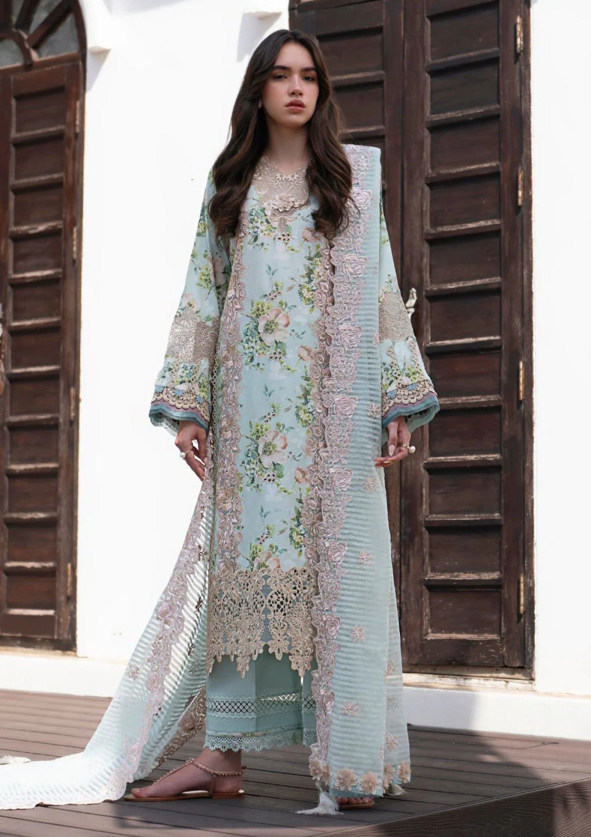 For understated sophistication, look no further than Myrtle! ðÃÂÃÂø Step into a garden of elegance with this beautifully crafted ensemble. A floral printed aqua canvas sets a fresh and serene backdrop for exquisite details. Notice the embroidered organza panel patti, adding a touch of sheer sophistication. The centre of the shirt features delicate chikankari embroidery all over the panel, creating a focal point of intricate artistry. The neckline is graced with resham thread embroidery, adding a subtle sheen. And that daman border! Resham thread embroidered in a cutwork style âÃÂàpure elegance. The sleeves are finished with a delicate border, and the embroidered dupatta, adorned with pinks and beige threads, adds a soft, contrasting element. Paired with dyed pants for a seamless silhouette, Myrtle is refined beauty personified.