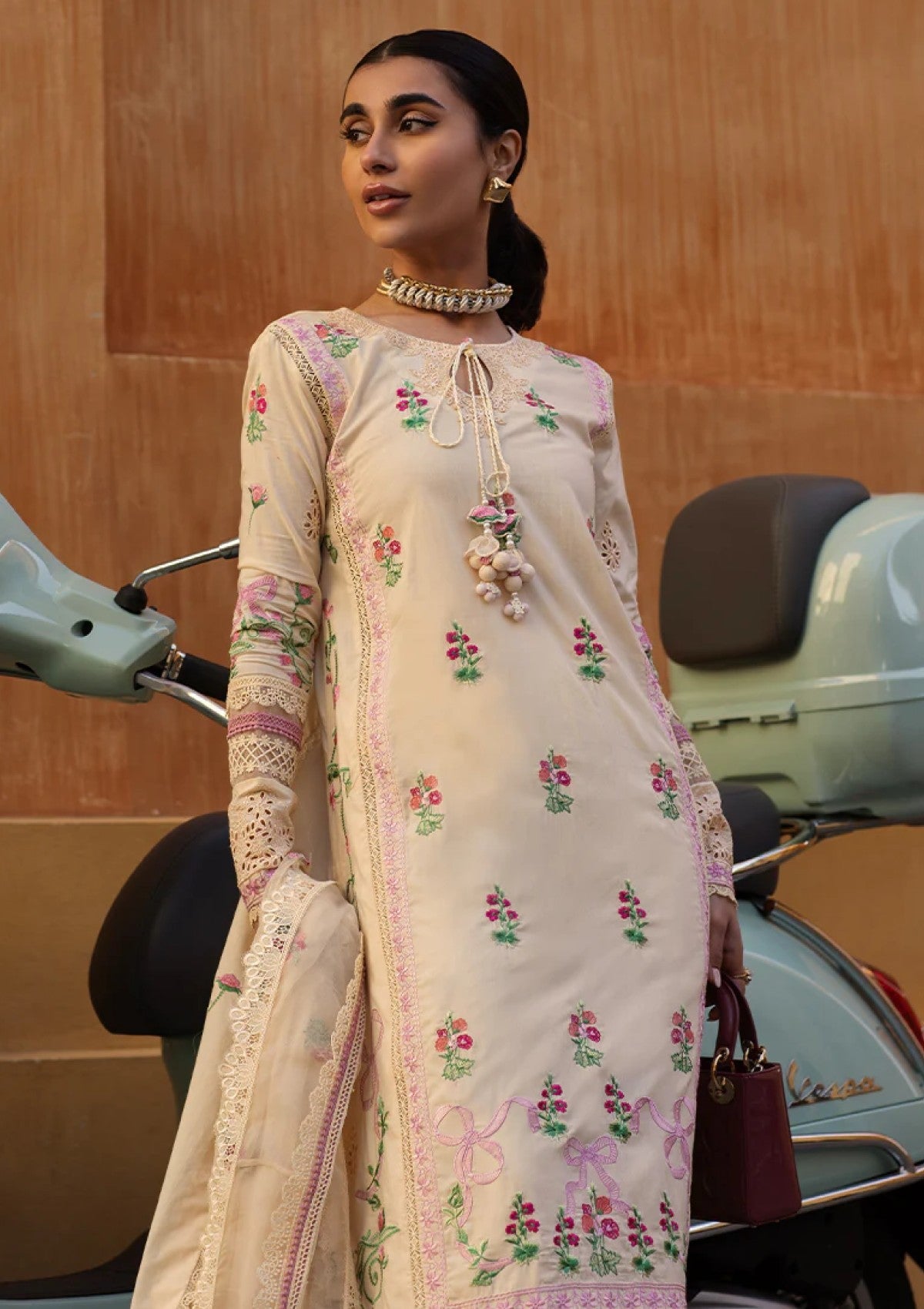 Rosalie, with its buttercream palette, exudes soft elegance through a variety of detailed embroidery stitches, including satin stitch and French knots, creating delicate floral motifs. Intricately embroidered organza borders enhance the sleeves, daman, and neckline, adding a touch of refinement.