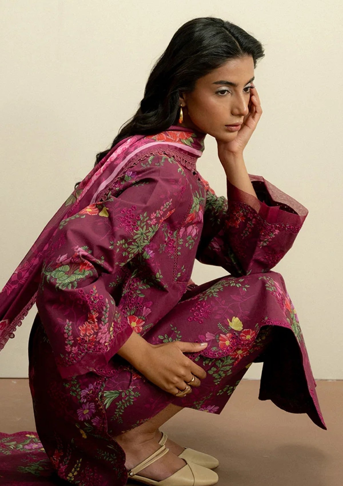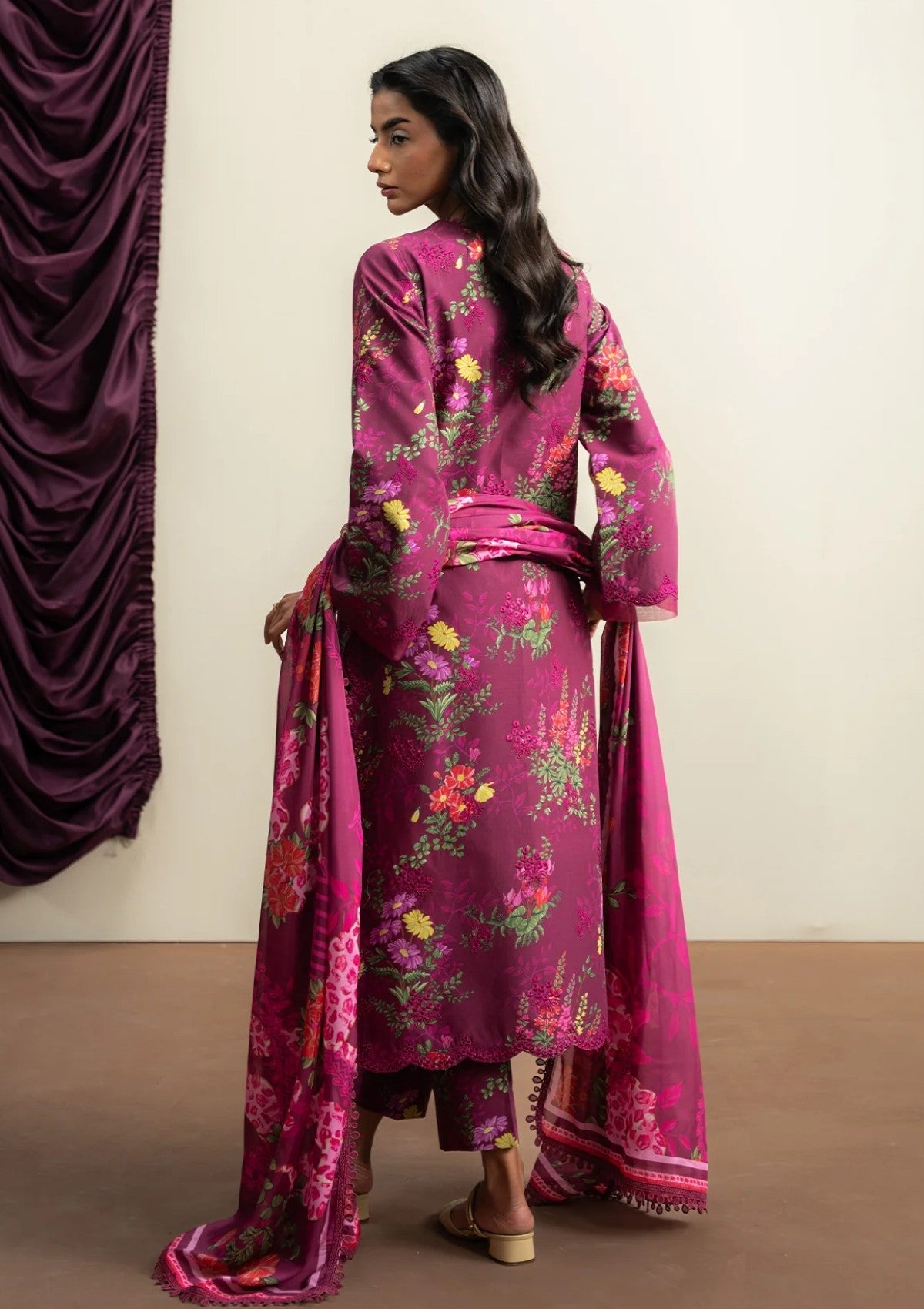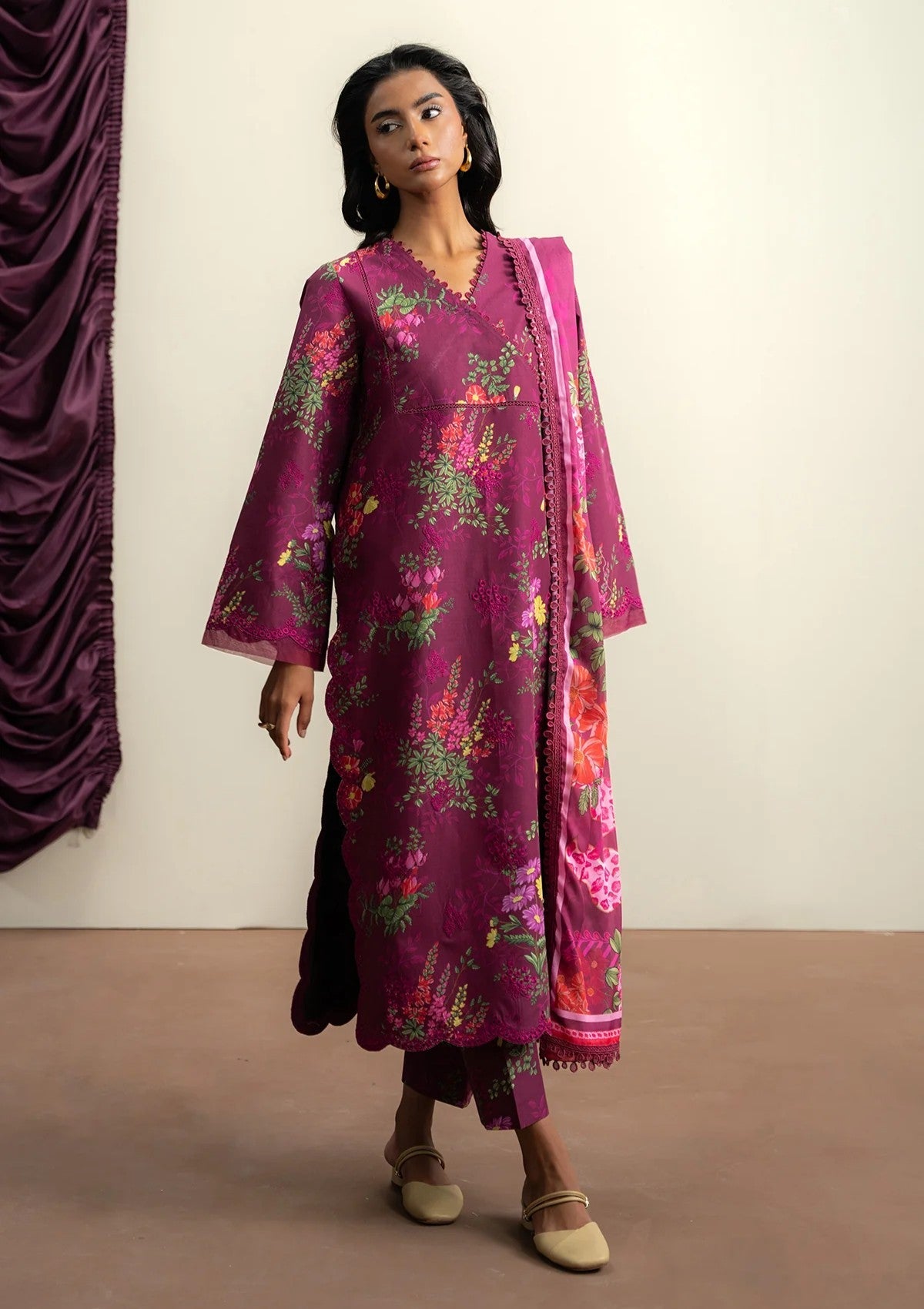 A vibrant floral print and a beautifully draped dupatta craft a summer ensemble that exudes freshness and sophistication.
