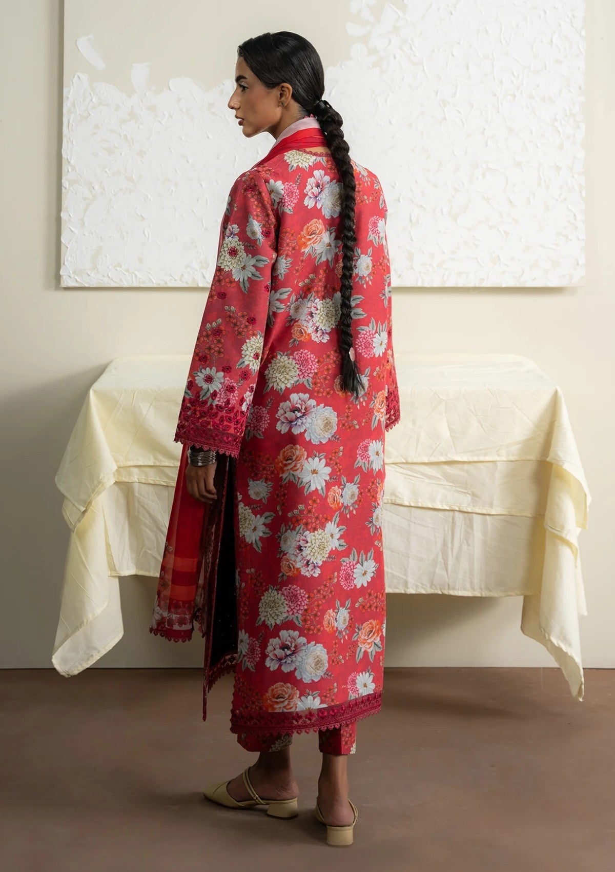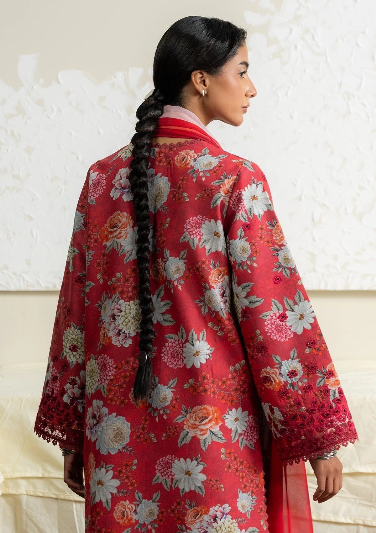 A captivating fusion of deep red tones delicate embellishments and a perfectly styled dupatta paired with a refined trouser.