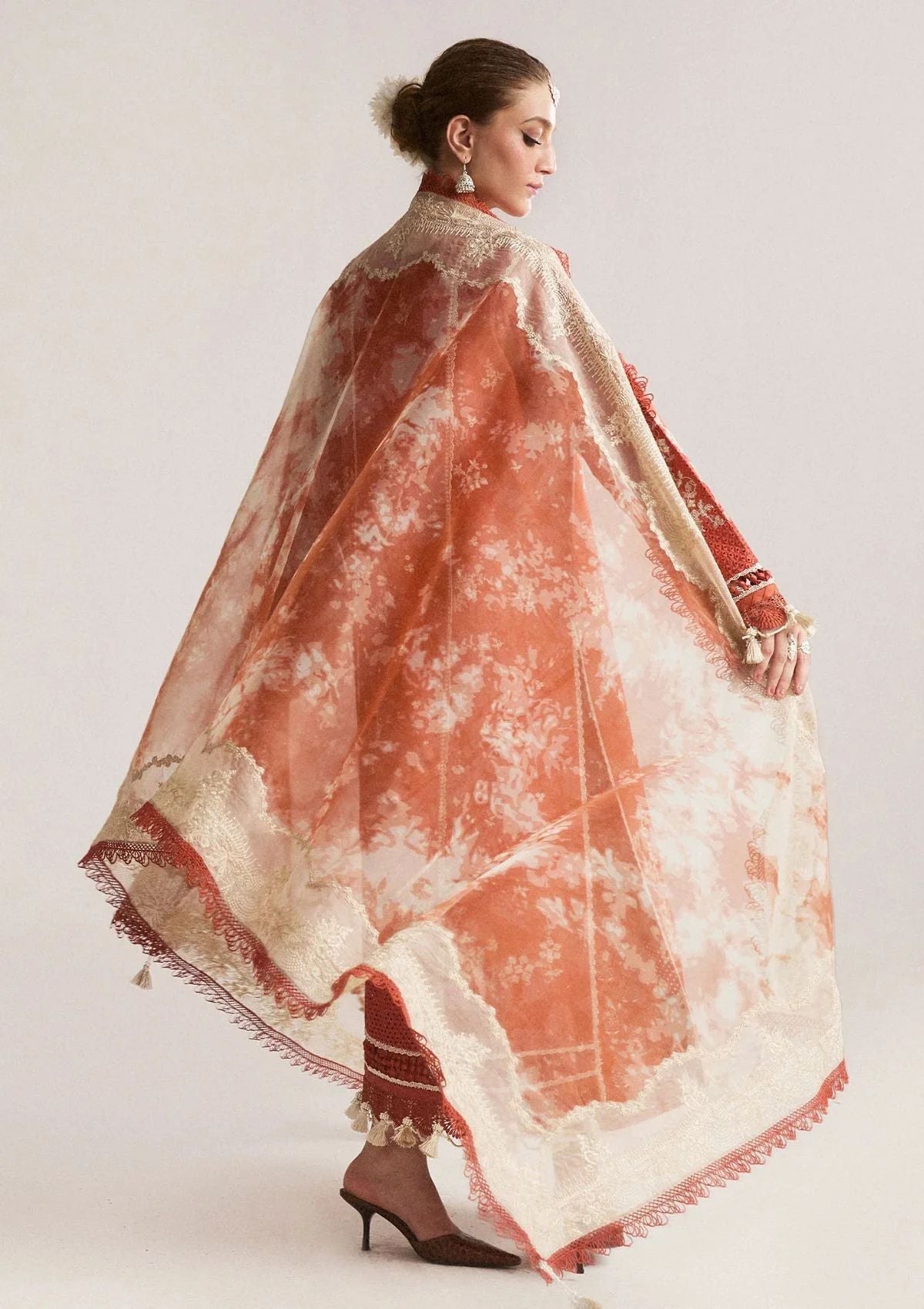 A fresh summery Rust ensemble adorned with intricate white embroidery with boring effect on the shirt and sleeve, paired with digital printed trousers. Rust and beige digital printed embroidered Organza dupatta looks this silhouette perfect for summer.