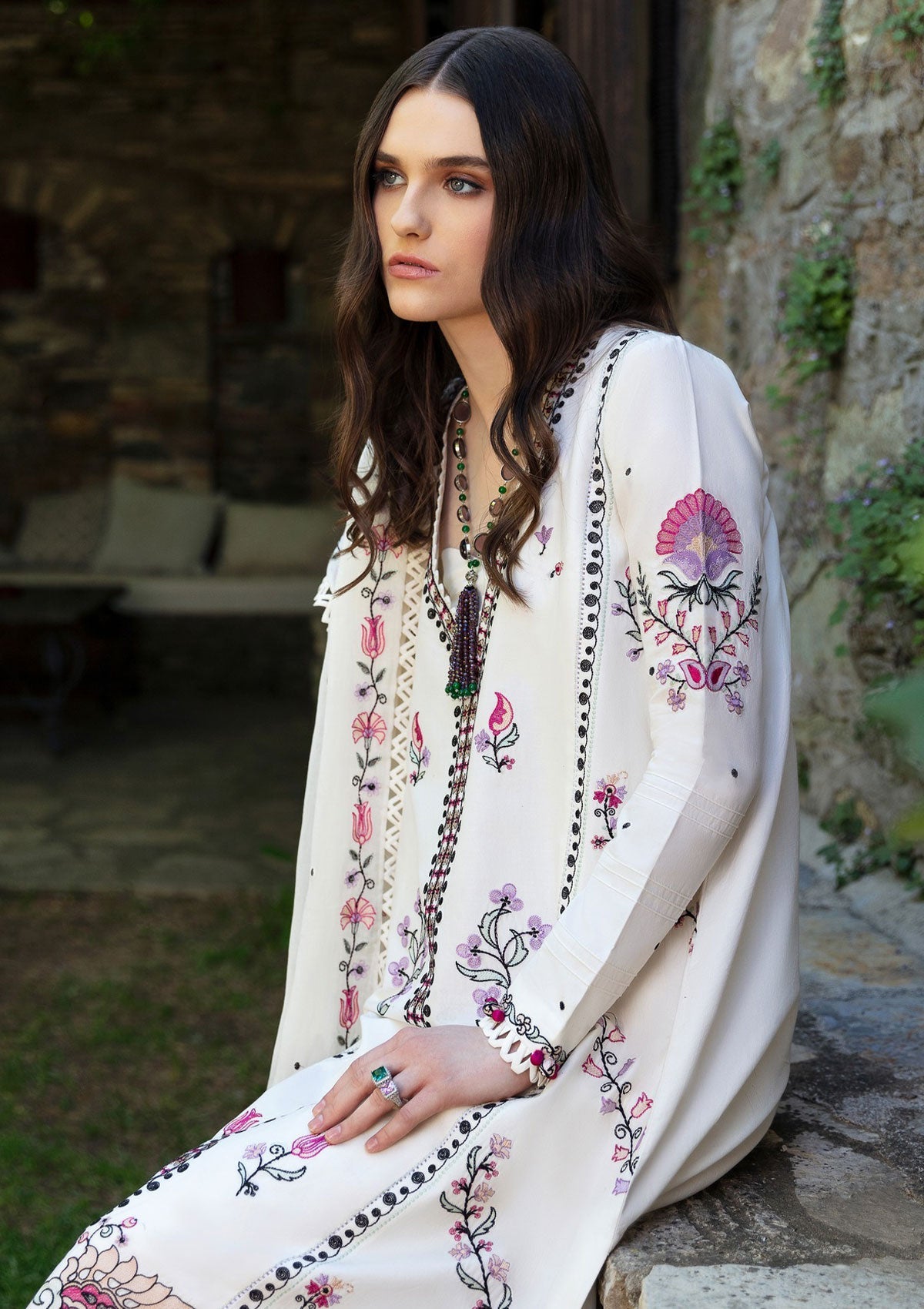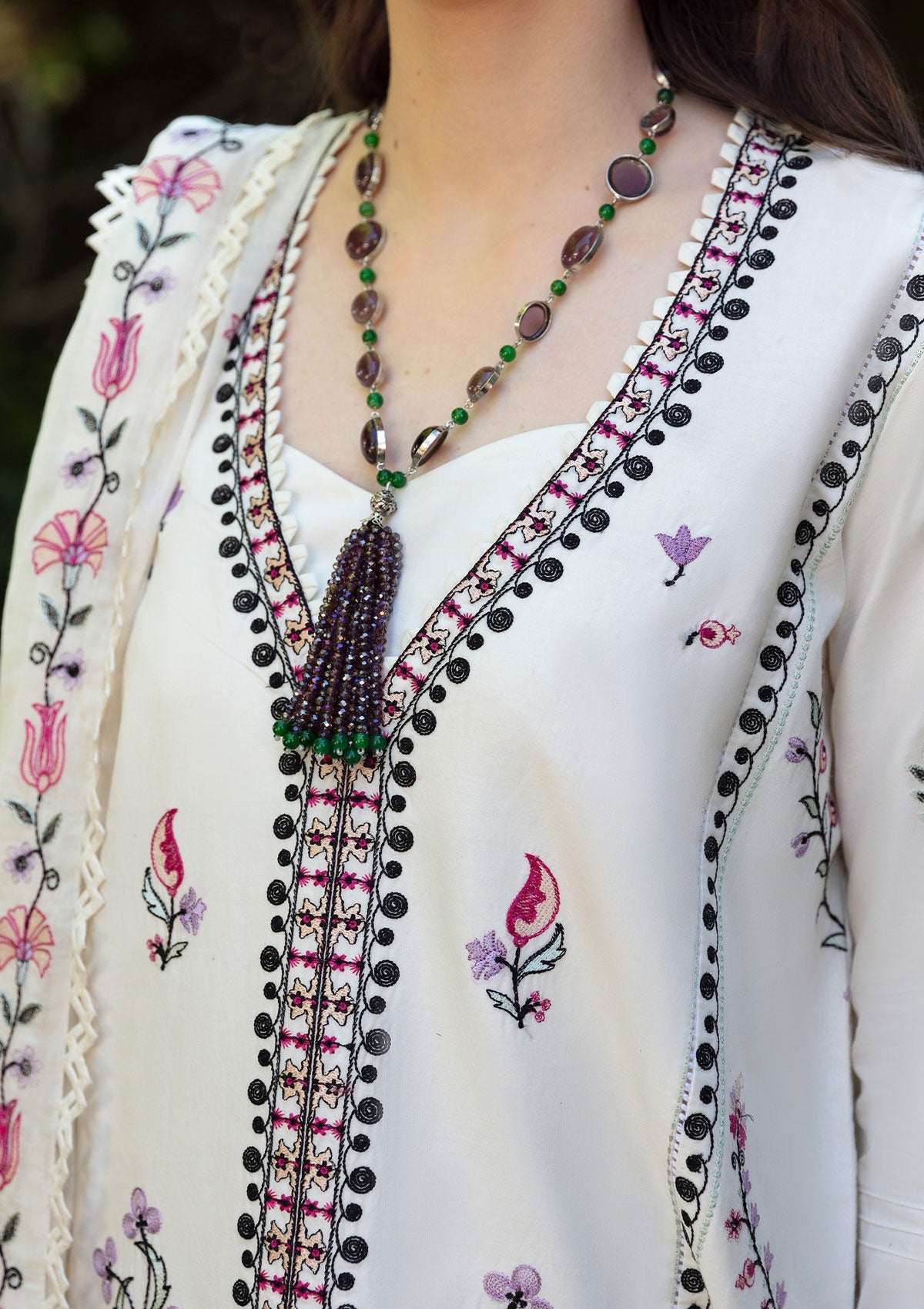 Behold the regal Muguet ensemble: A three-panel symphony of Suzani floral Uzbek embroidery cascading over every inch. Adorned with delicate sleeve embroidery and an ethereal organza patch, its elegance knows no bounds. The Swiss voil dupatta whispers tales of intricate craftsmanship, while the plain cambric trousers lend an air of understated sophistication.