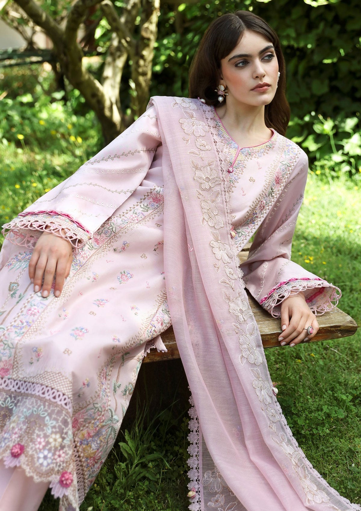 MÃÂélÃÂèze showcases modern Kashmiri needlework techniques on a printed pink fabric, accented with organza and delicate embroidery. This piece combines tradition with contemporary aesthetics, offering a unique and stylish look.