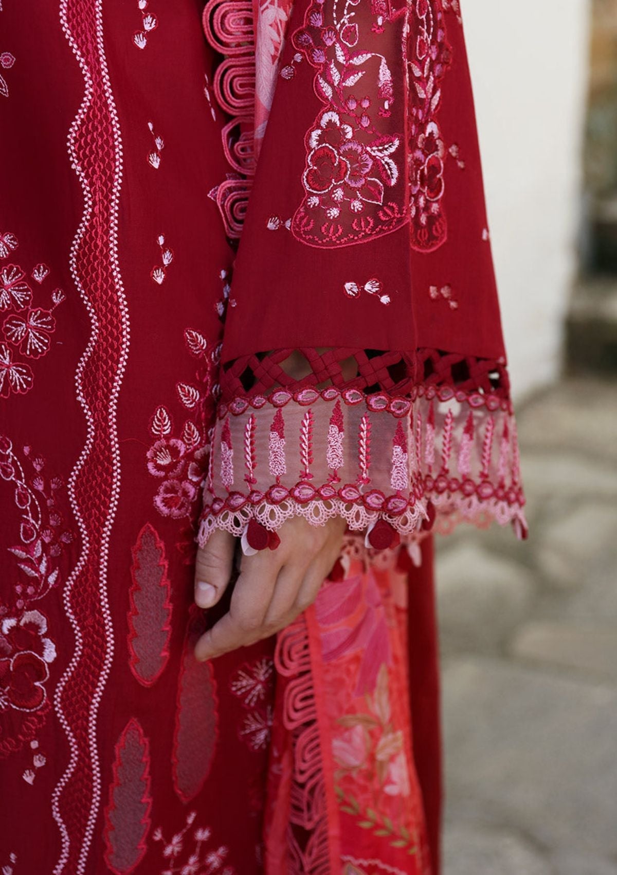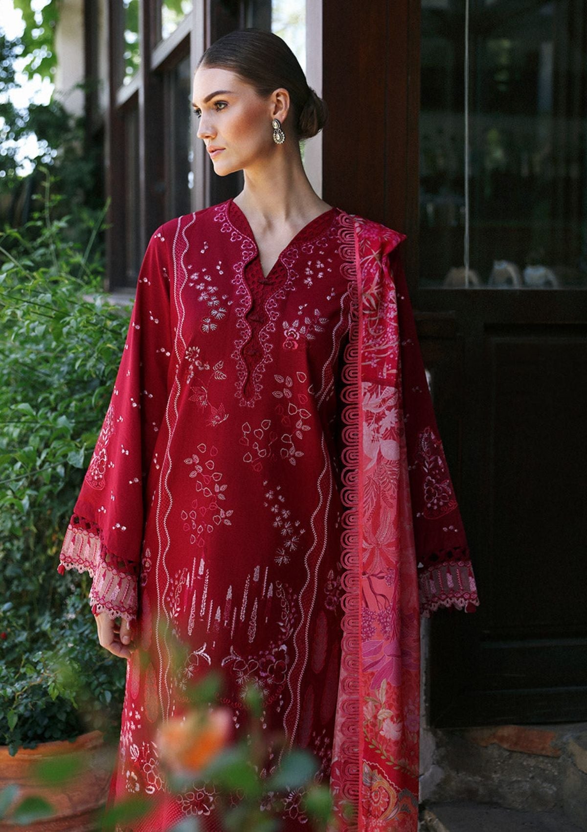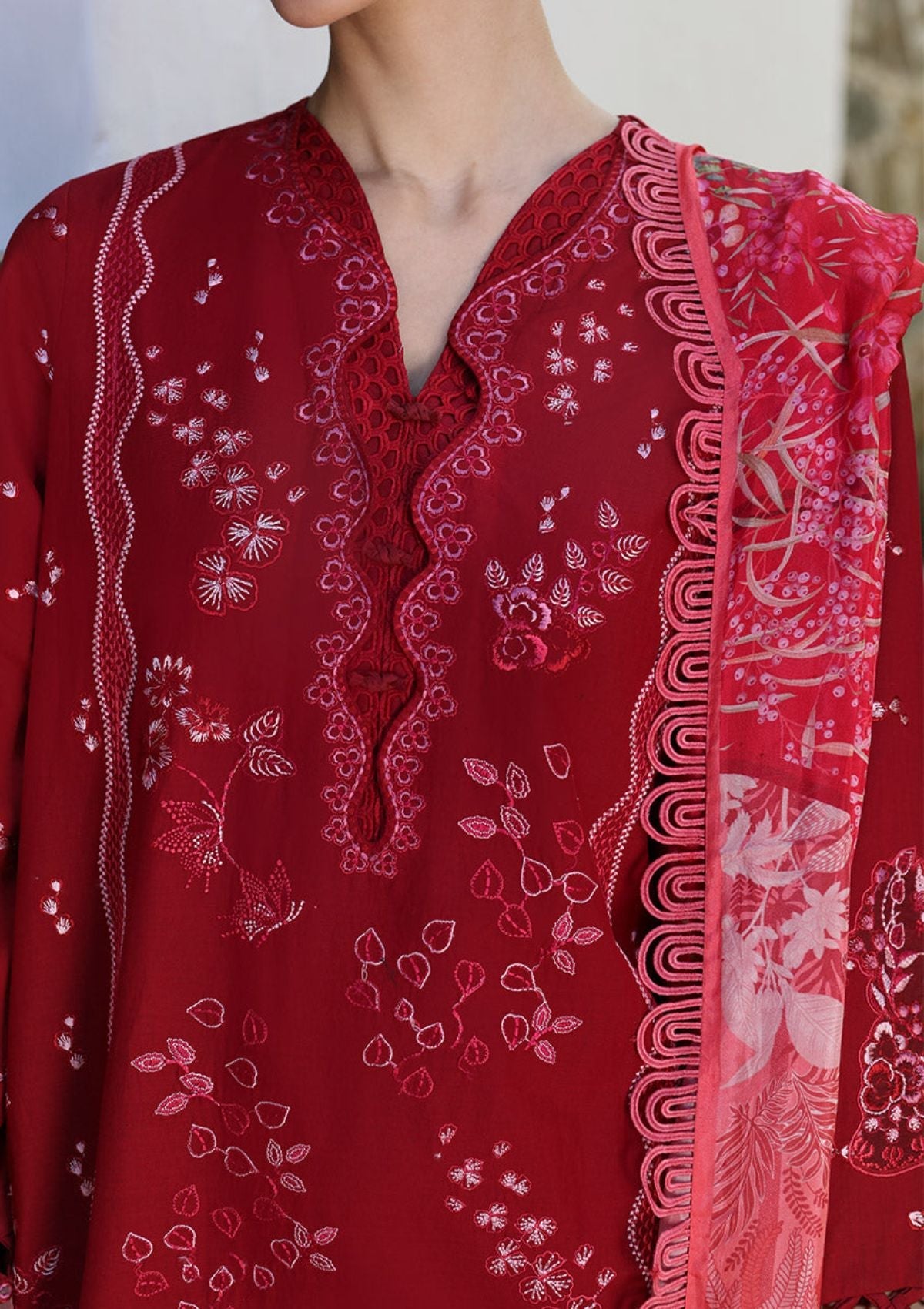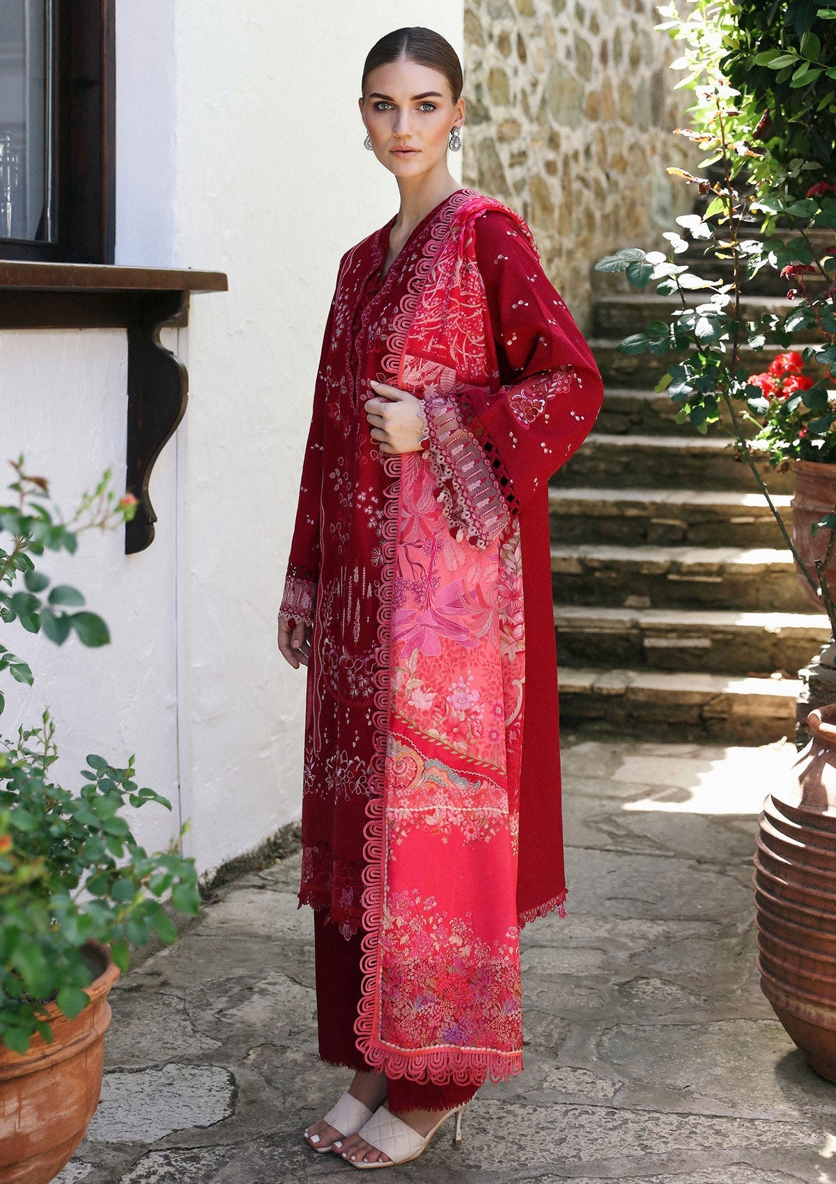 Lunara's striking red lawn base is richly embroidered with floral motifs in mono colors, creating an eye-catching effect. Paired with a colorful silk dupatta, this piece is perfect for making a bold and elegant statement.