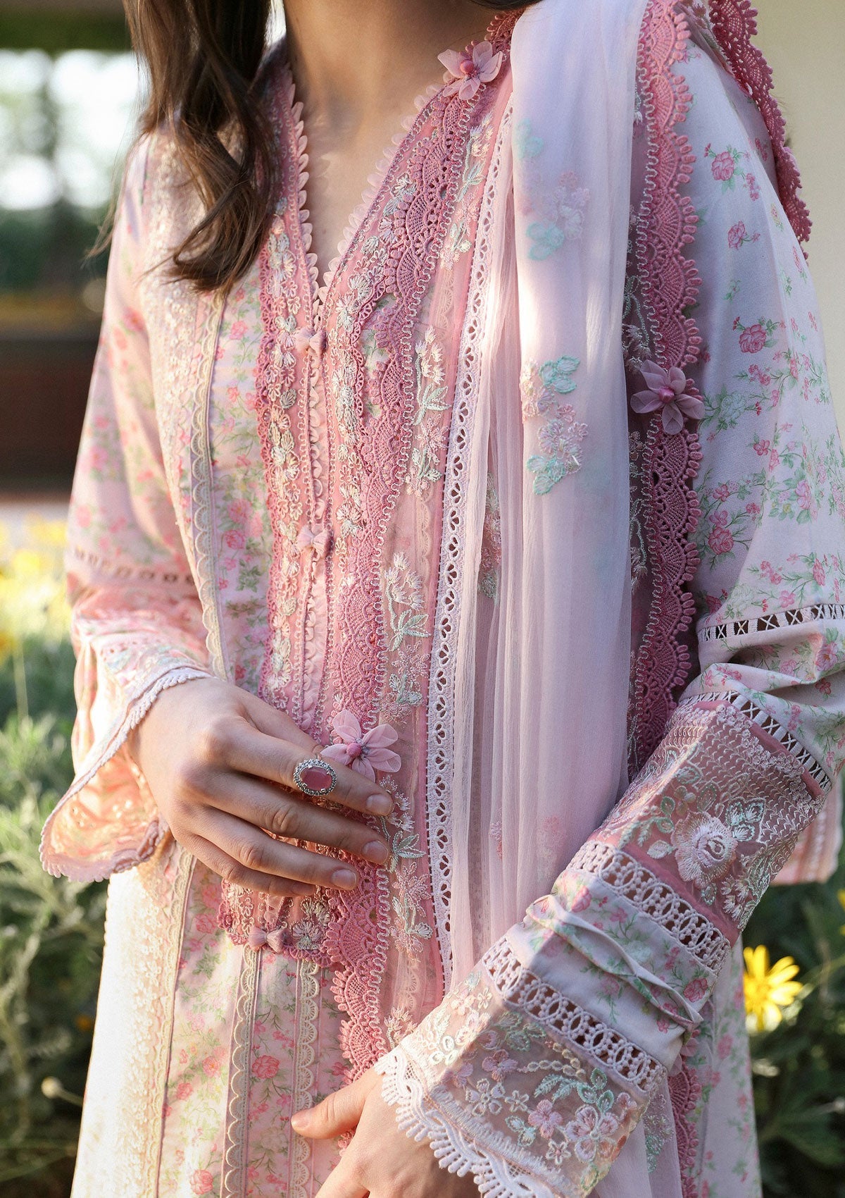 Rosa features a beautiful floral printed shirt in shades of pinks and greens, accented with white organza borders and a floral embroidered chiffon dupatta. This design exudes a delicate and refined elegance, perfect for any occasion.
