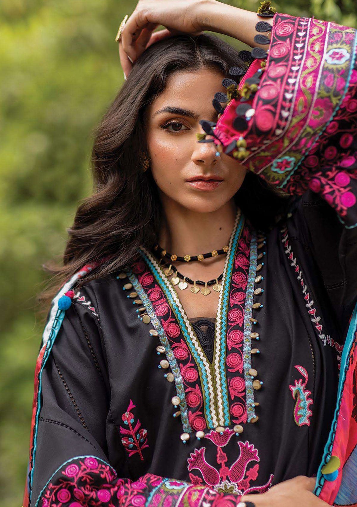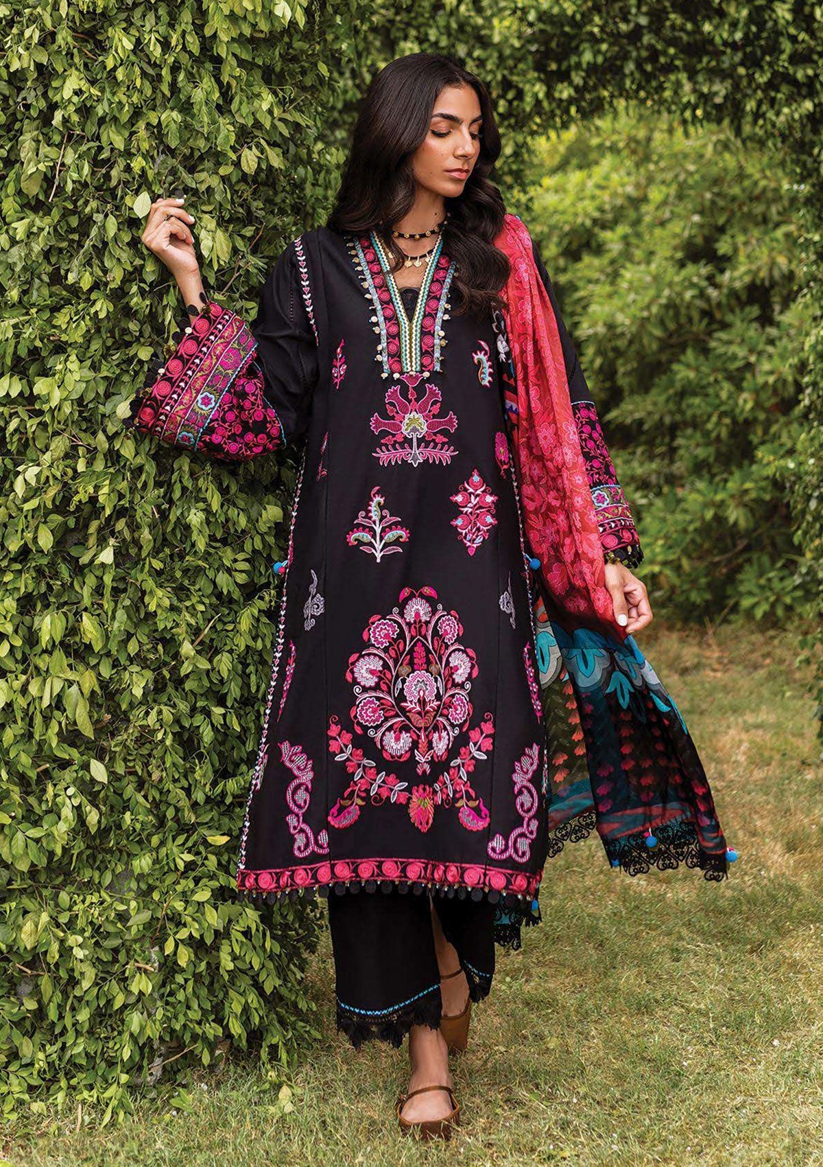 Ada - Is our take on bold minimalism. Fierce and dramatic. A scatter of sharp floral motifs harmoniously spread over a soft but deep toned canvas of summer lawn as a matching set with a vibrant contrasting silk digital printed dupatta.