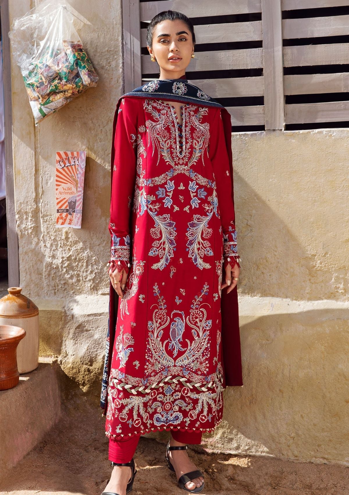 Description:Delicately embroidered florals and quirky parrots rendered in ivory, navy sage and red bloom on a bright scarlet canvas in âÃÂÃÂGizem.' It comes paired with a contrasting midnight blue dupatta with embroidered borders lending contrast to the look. This makes for an unforgettable look that will effortlessly take you from day to night this coming season.