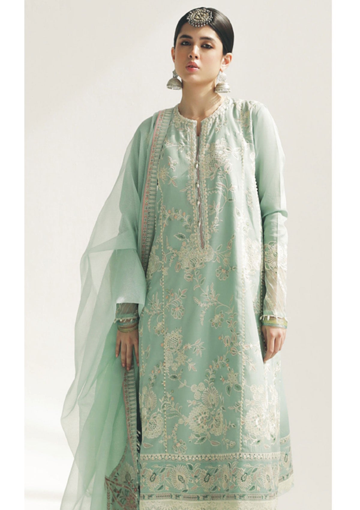 The Amira kurta wraps you in soothing tones of summer, creating the perfect backdrop for a summer breakfast with friends. It features an embroidered jaal on the shirt, a karandi net dupatta with beautiful corner motifs and printed pants.