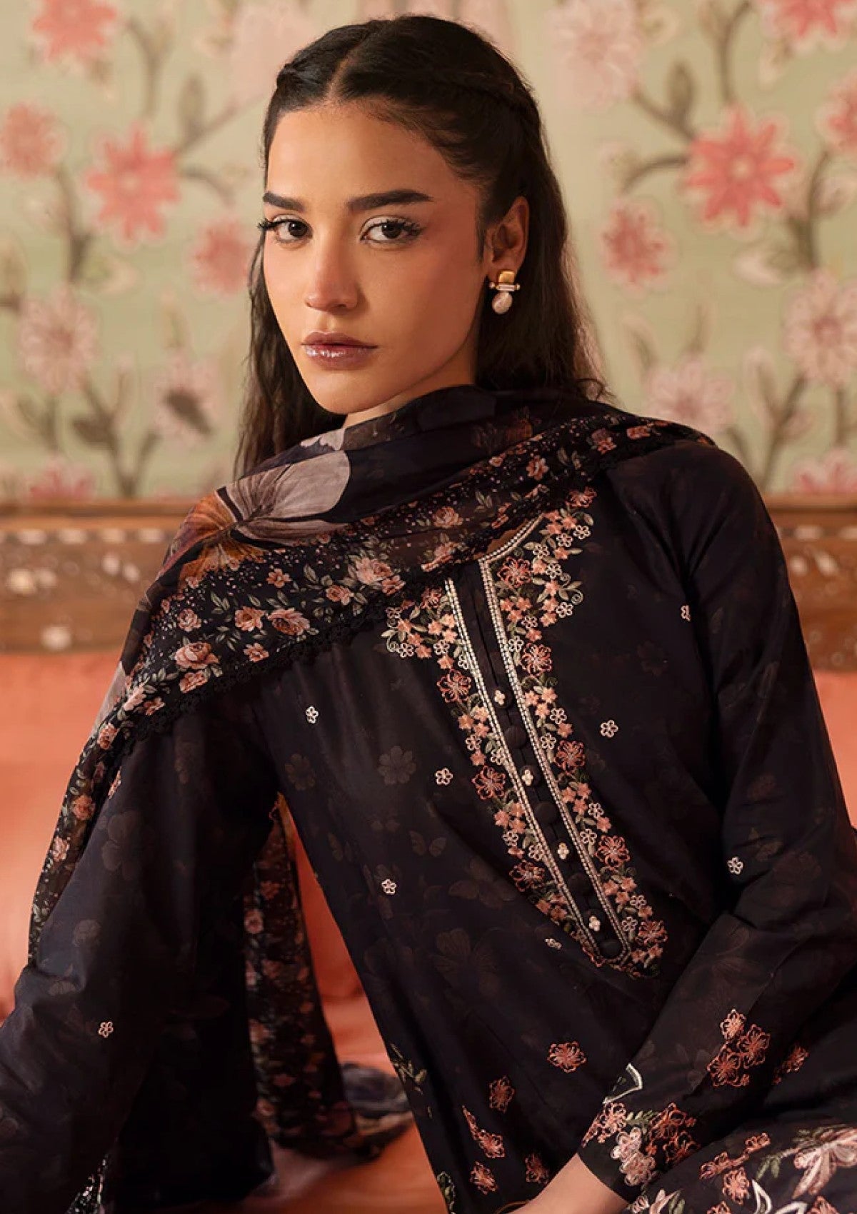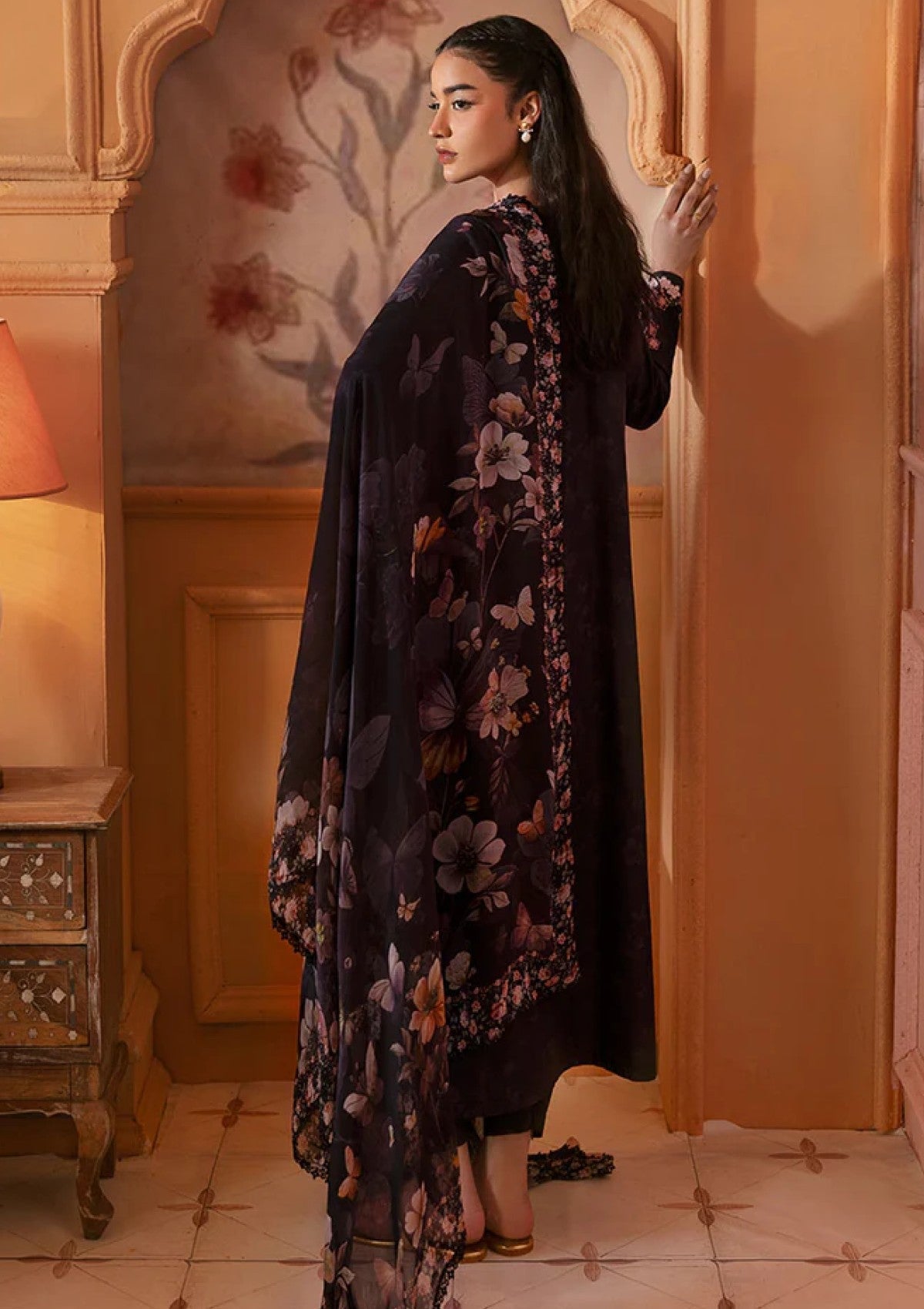 Elevate your style with CAVIAR CHARM-3PC PRINTED LAWN SUIT. The lawn printed & embroidered shirt features a printed back and 40" embroidered patti, while the cambric dyed trouser and silk printed dupatta complete the look. Perfect for a sophisticated and stylish ensemble.