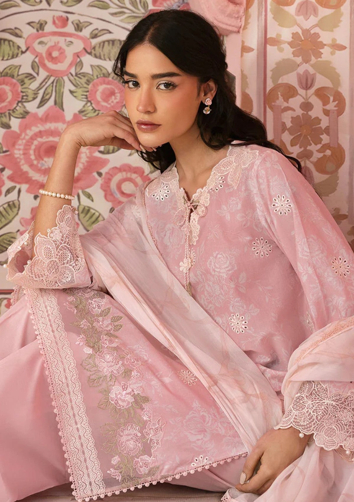 This 3-piece FLORAL TIE LAWN SUIT features a printed and embroidered shirt with a 60" patti for sleeves and a 40" patti for hem, a cambric dyed trouser with a 60" embroidered patti, and a chiffon printed dupatta. Elevate your style with this elegant and intricately designed suit.