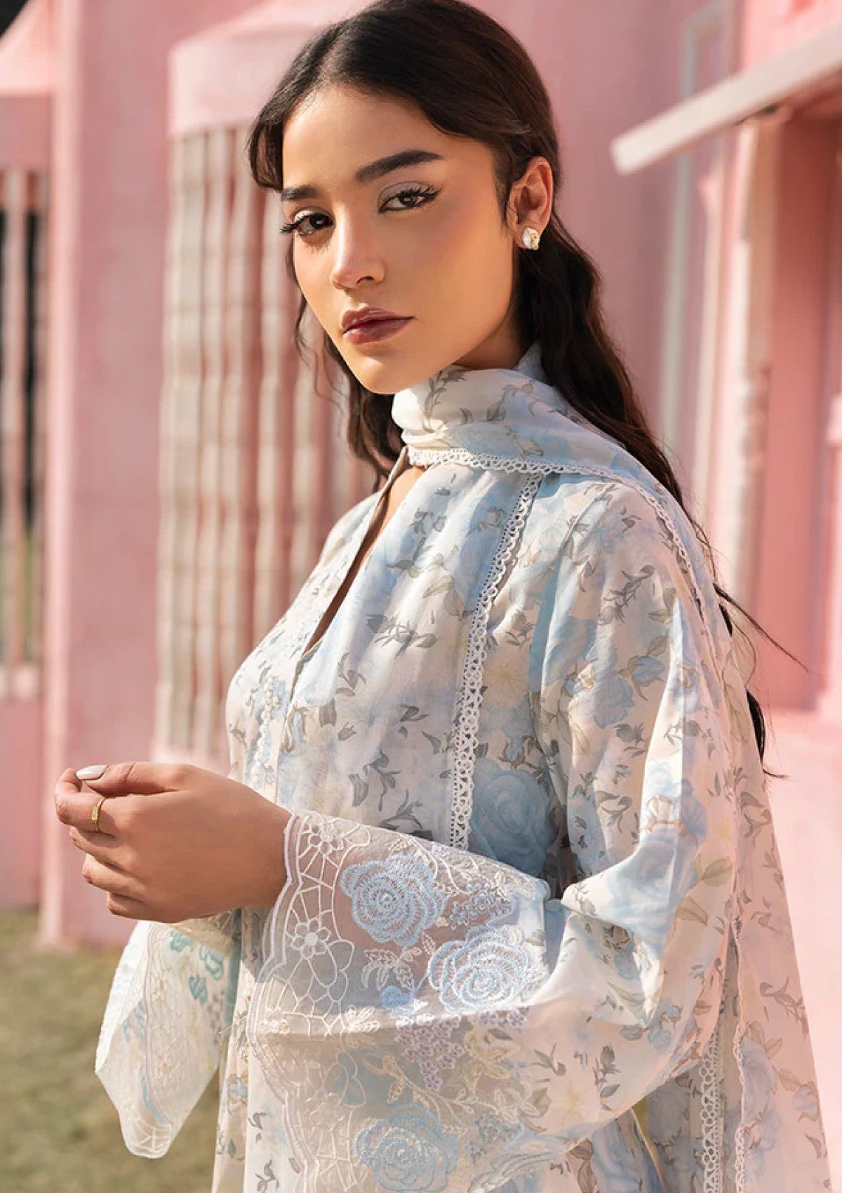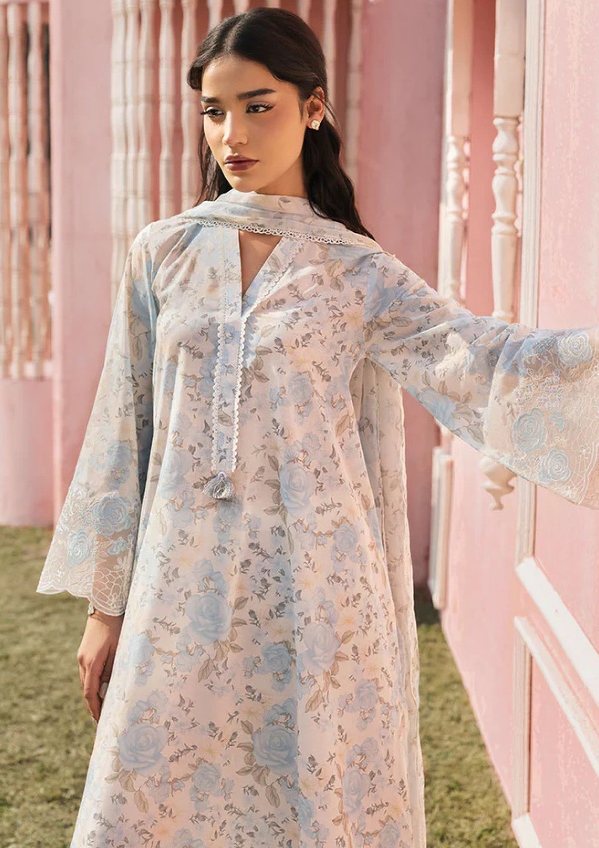 Elevate your style with our MYSTIC HAZE-3PC PRINTED LAWN SUIT. The lawn printed shirt features a beautiful 40" embroidered patti for the hem and 60" embroidered patti for the sleeves. The cambric dyed trouser adds to the elegance while the silk printed dupatta completes the look. Perfect for any occasion, this suit will surely make you stand out.