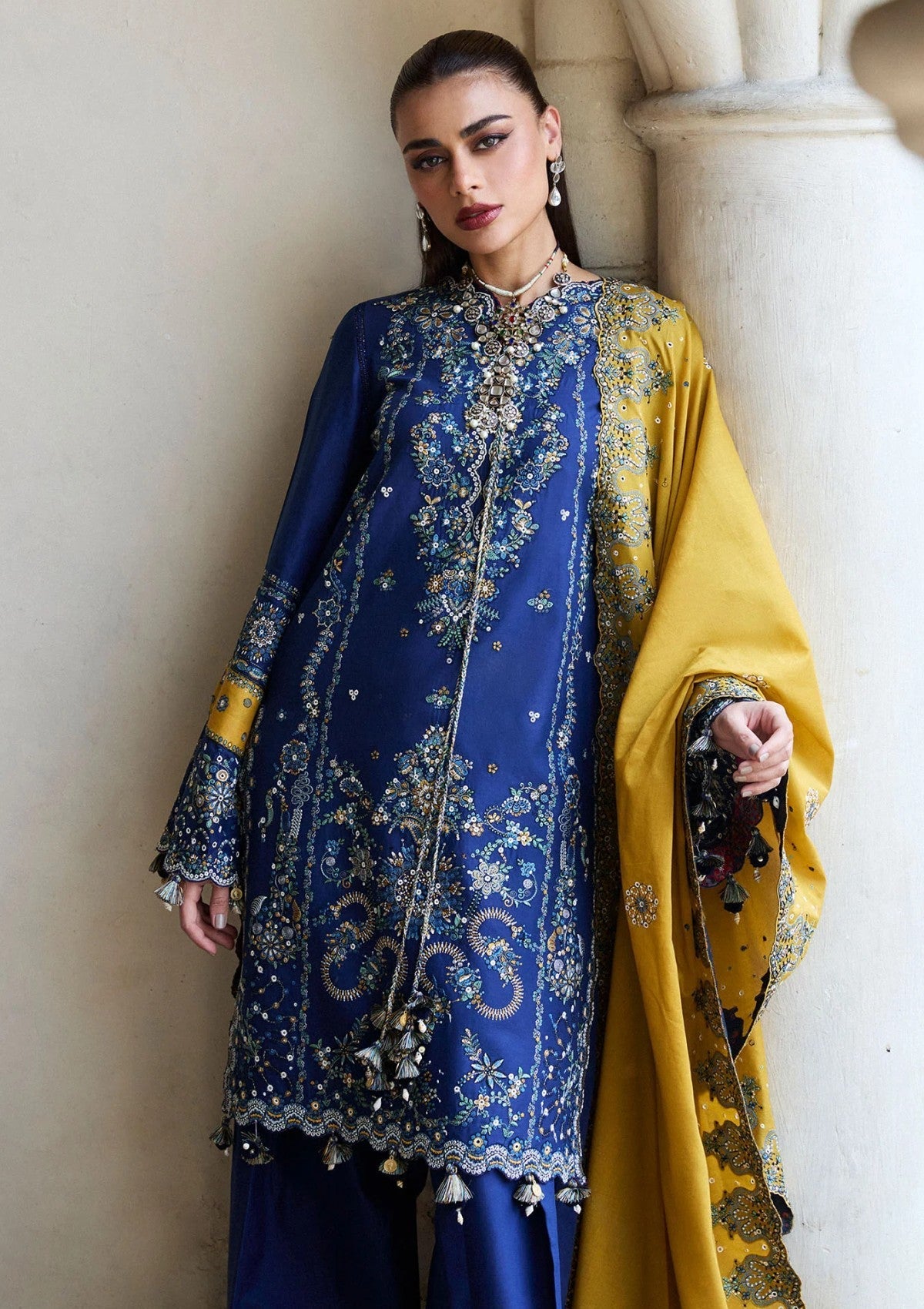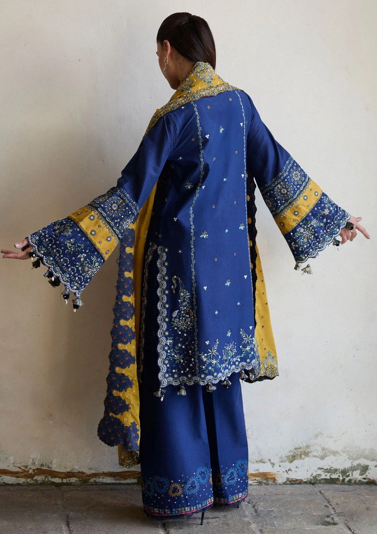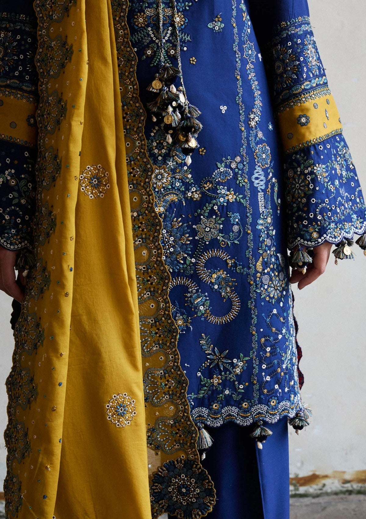 A blue ensemble presents a picturesque vision of rich tradition and sophistication, enhanced by meticulously executed embroidery on lawn fabric. Alluring floral embroidery, combined with a boring technique, creates a luxurious look through its carefully chosen color palette. A mustard-colored lawn dupatta, featuring color-blocked embroidery, complements the ensemble. This modern and dazzling silhouette is completed by coordinating blue cotton embroidered shalwar.