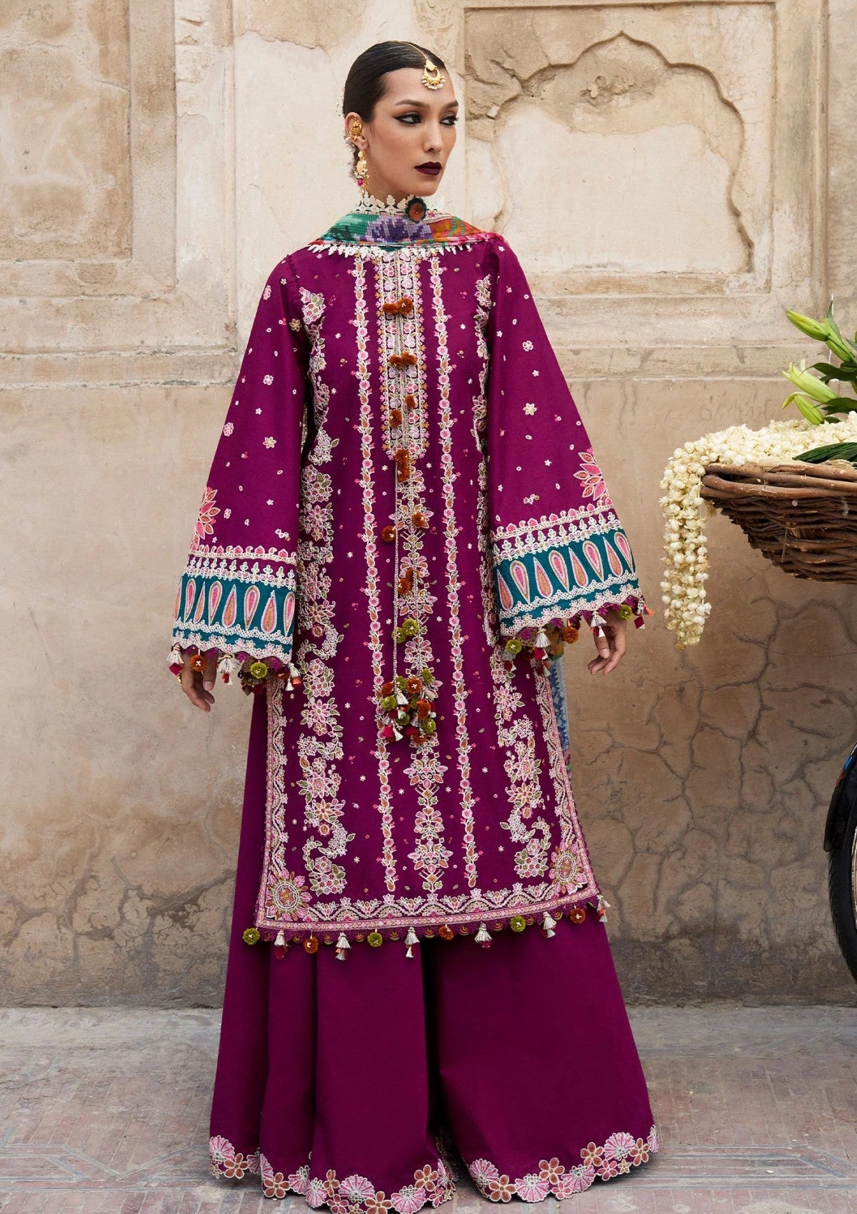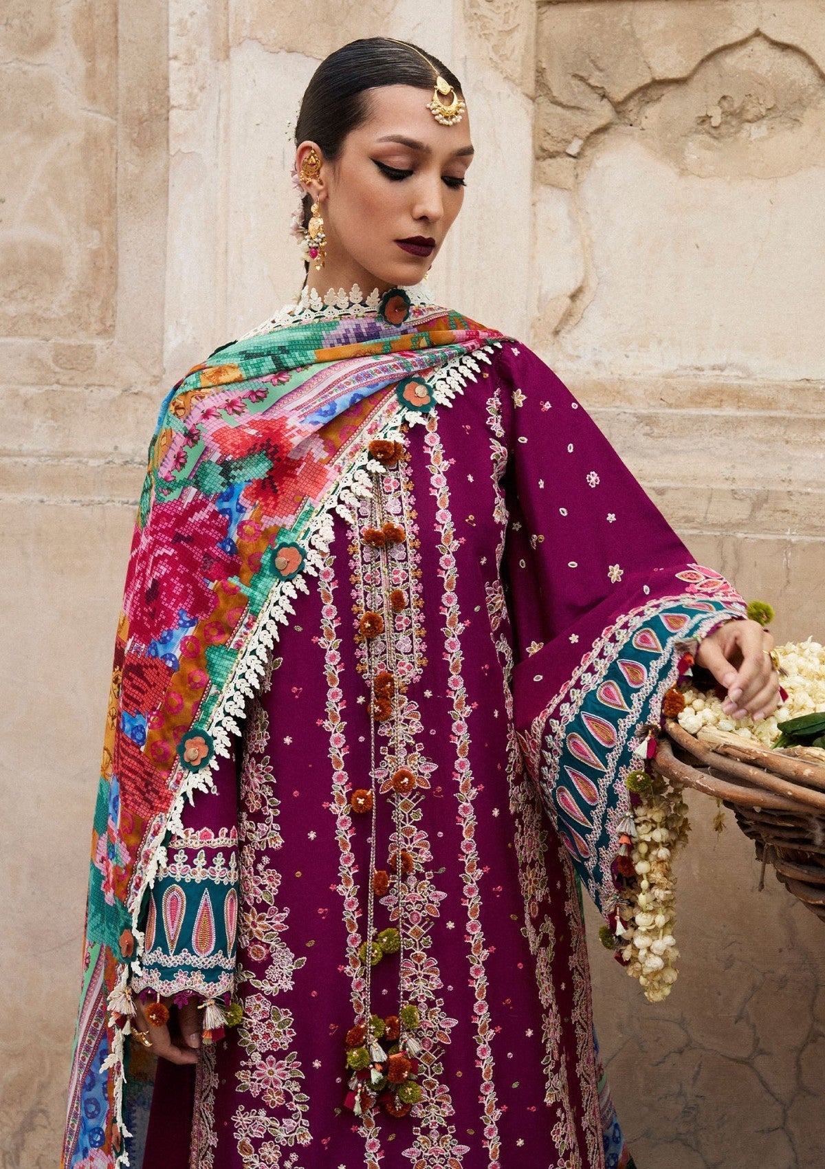 A plum-colored outfit ensemble creates a picturesque view of trendy and modern style, infused with skillfully executed embroidery on the finest lawn fabric. It features modern and varied embroidery stitch details. Alluring modern elements are combined with intricate embroidery in hues of ivory, orange, pink, lilac, olive green, and lime yellow, resulting in an ethereal look. The shirt showcases different embroidery techniques, including a color-block embroidery patch on the sleeves. A printed dupatta, along with matching cotton embroidered trousers, completes this dazzling and contemporary silhouette.