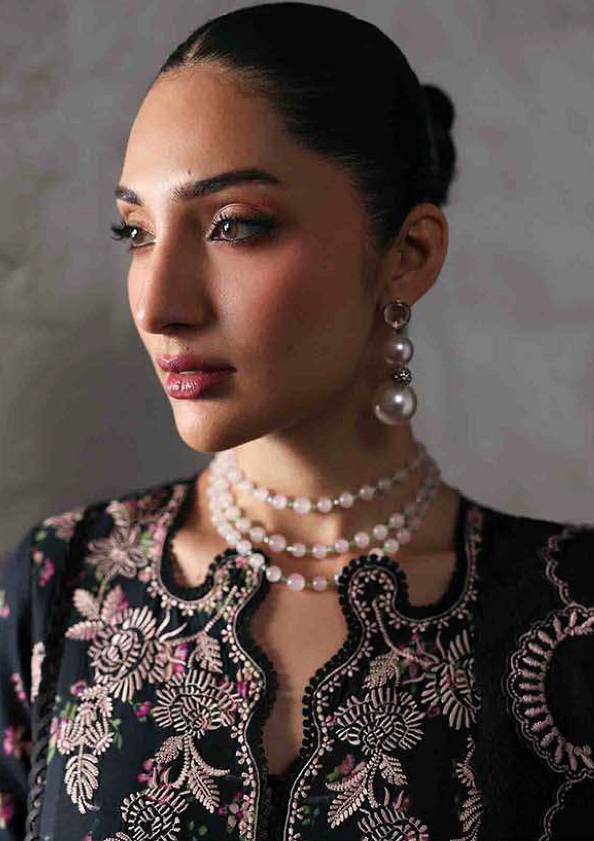 A graceful three-paneled shirt unfolds with a floral-printed base in soft, romantic shades of pink, each bloom enhanced by delicate satin stitches that trace textured floral lines across the surface like whispered poetry. Paired with a lightweight rocket net dupatta, framed on all sides with intricate embroidery, this ensemble evokes an air of effortless elegance and timeless femininity.