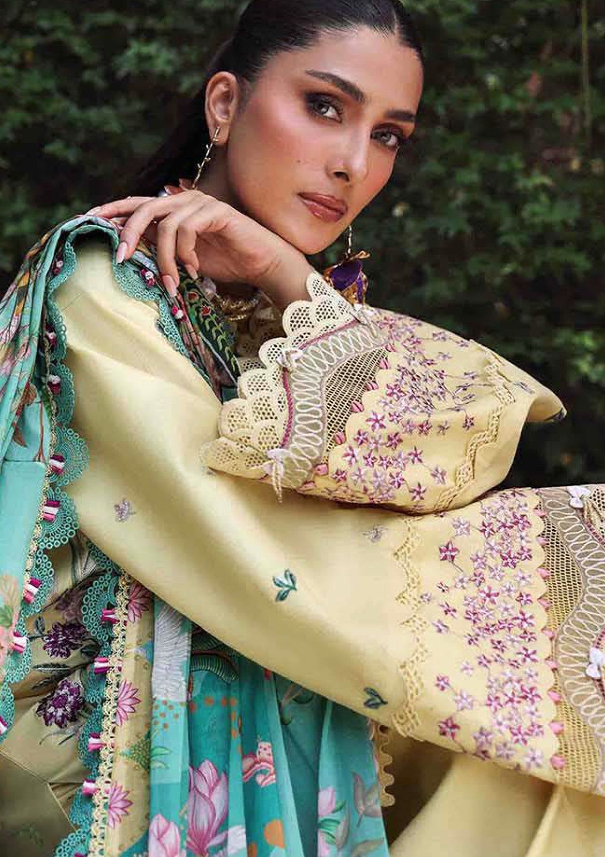 Where heritage meets contemporary charm, this three-piece ensemble features a soft light yellow shirt adorned with intricate floral vine and leafy swirl embroidery in vibrant tones of magenta, coral, and pink. Complementing it is a striking Aqua voile printed dupatta, embellished with a majestic shikargah design, reflecting a perfect blend of classic craftsmanship and sophisticated elegance.