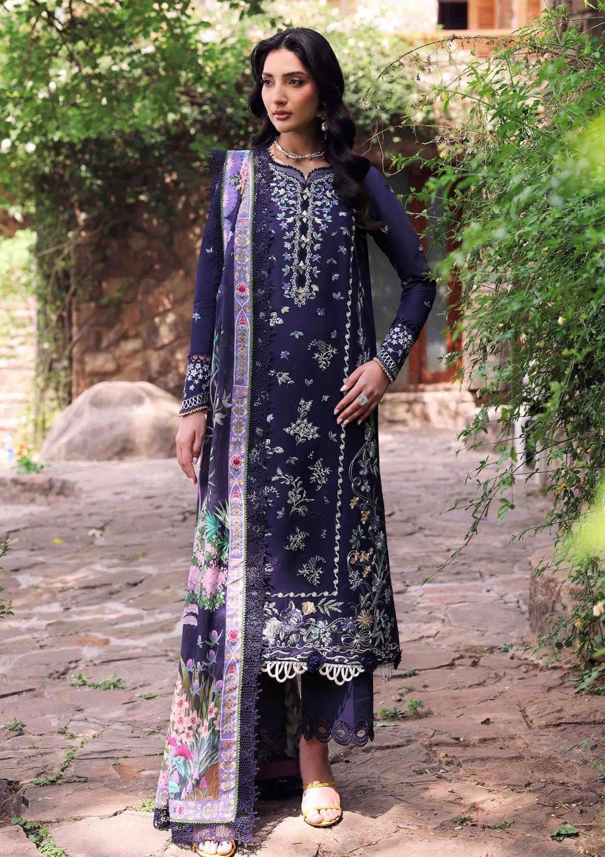 Blending traditional artistry with modern sophistication, this three-piece ensemble showcases a navy blue shirt embellished with delicate floral vines and swirling leaves, intricately embroidered in rich shades of purple, blue, and subtle touches of yellow. Paired with a coordinating blue printed voile dupatta featuring an opulent shikargah motif, the outfit embodies a refined harmony of timeless design and contemporary flair.