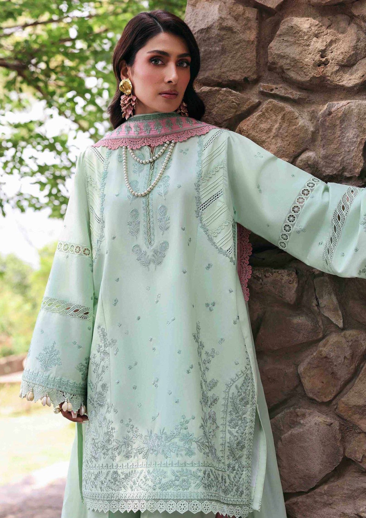 In a refreshing mint green hue, this three-paneled shirt blooms with a delicate mono floral design, subtle yet full of charm. Paired with a breezy chiffon dupatta, its beauty is framed by a bold pink satin border on all four sides adding a striking statement to this whisper soft symphony of color and grace.
