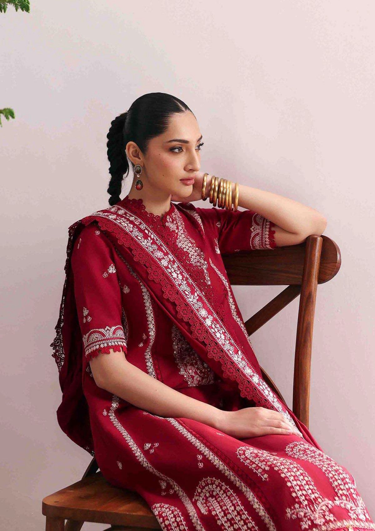 In a radiant hue of red, this ensemble is adorned with whispers of delicate embroidery, weaving shades of crimson and white into a tapestry of repeated ethnic motifs. Each stitch echoing timeless tradition. The look is gracefully completed with a voile dupatta, its four-sided border framing the piece like the final brushstroke on a work of art.