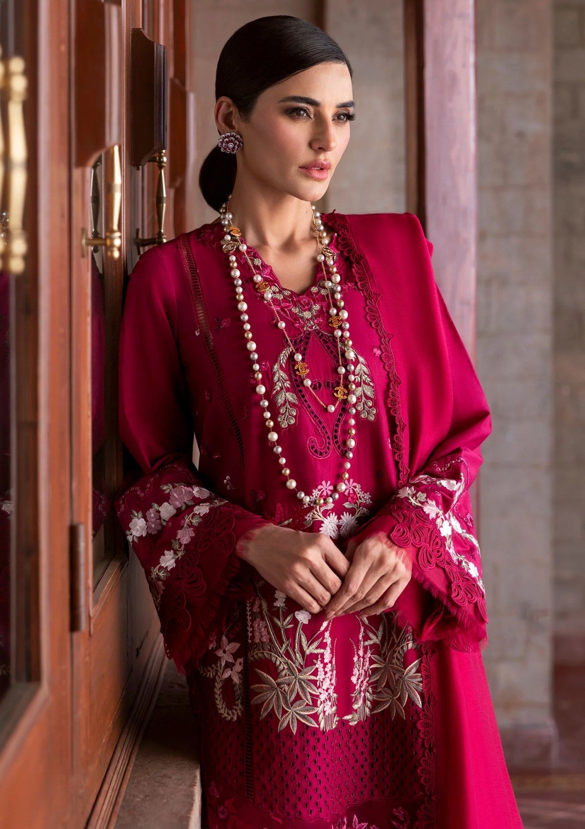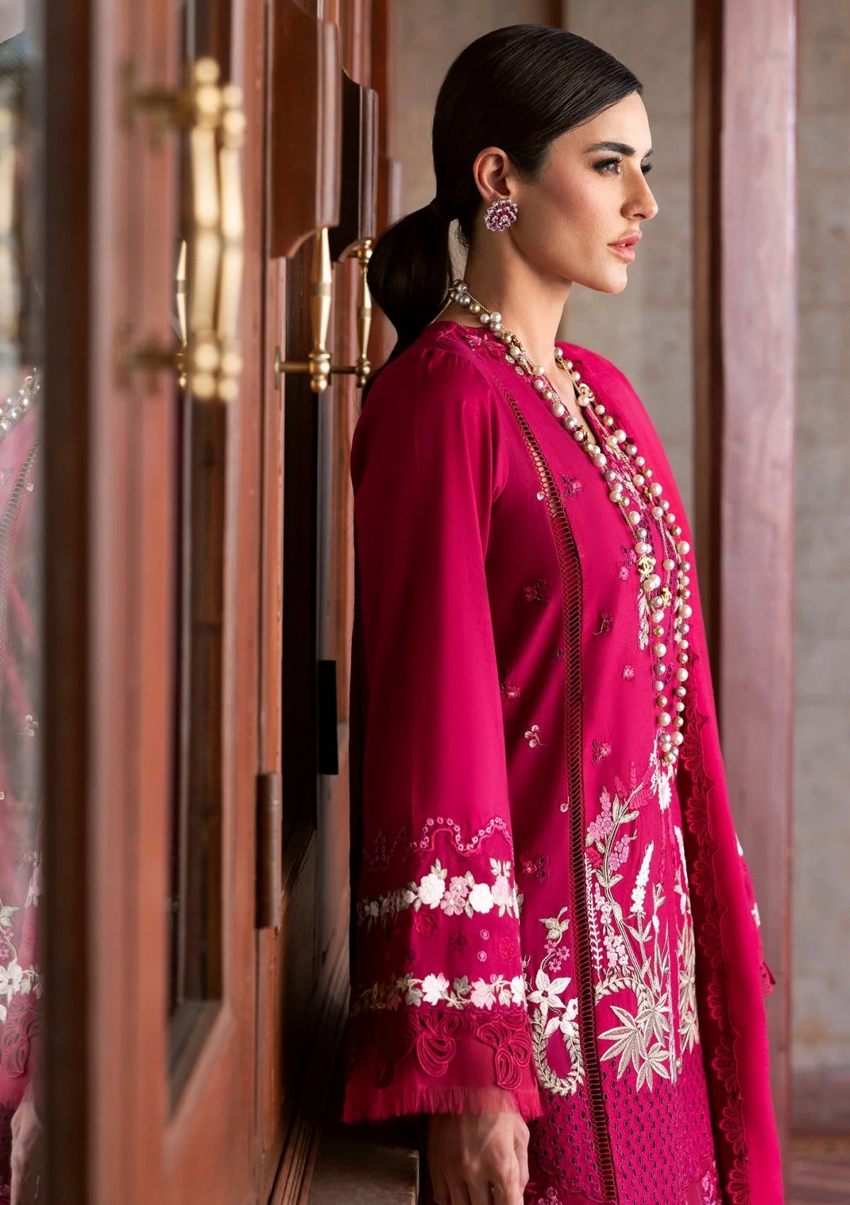 Our final reveal is the epitome of feminine grace. Enchanted with delicate floral embroideries in shades of berry and soft blush threadwork on the daman along with cutwork embroidery finished with a ghara border on organza. This ensemble evokes the dreamy elegance of hand-sketched botanicals reminiscent to a secret garden. A feather-light monar dupatta-its pallus adorned with ethereal florals drifting in a gentle breeze,