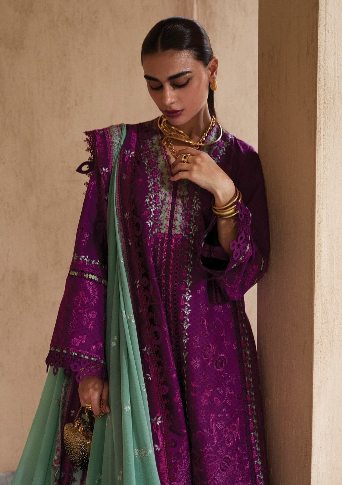 Cradled between spring and summer, our new collection beautifully mergesheritage with a fresh perspective. Imagine yourself wearing an exquisite plumjacquard cotton shirt, embellished with subtle monotone embroidery and detailedfour-panel design. When complemented by a stone green chiffon dupatta,featuring stunning embroidery and chic plum borders, this outfit exudes grace andrefinement with a cambric trouser, Ideal for Eid festivities, it truly embodies theessence of timeless elegance.