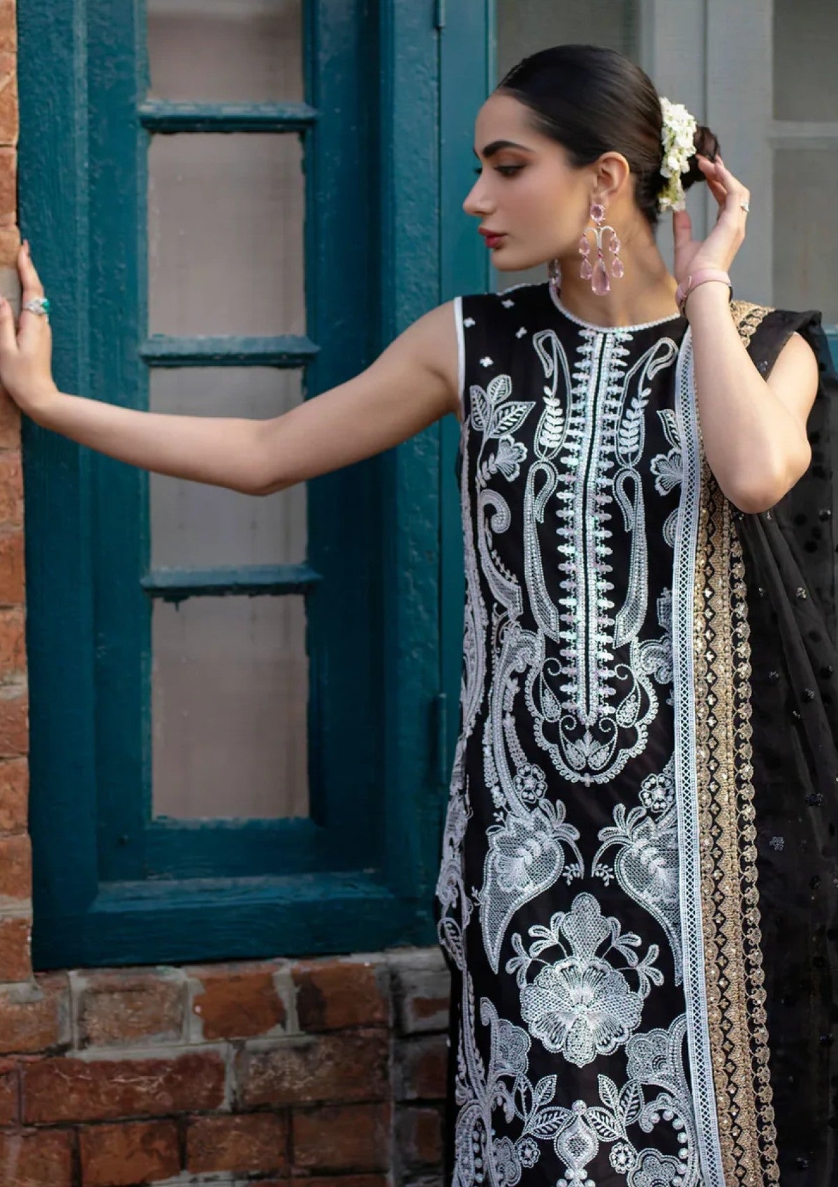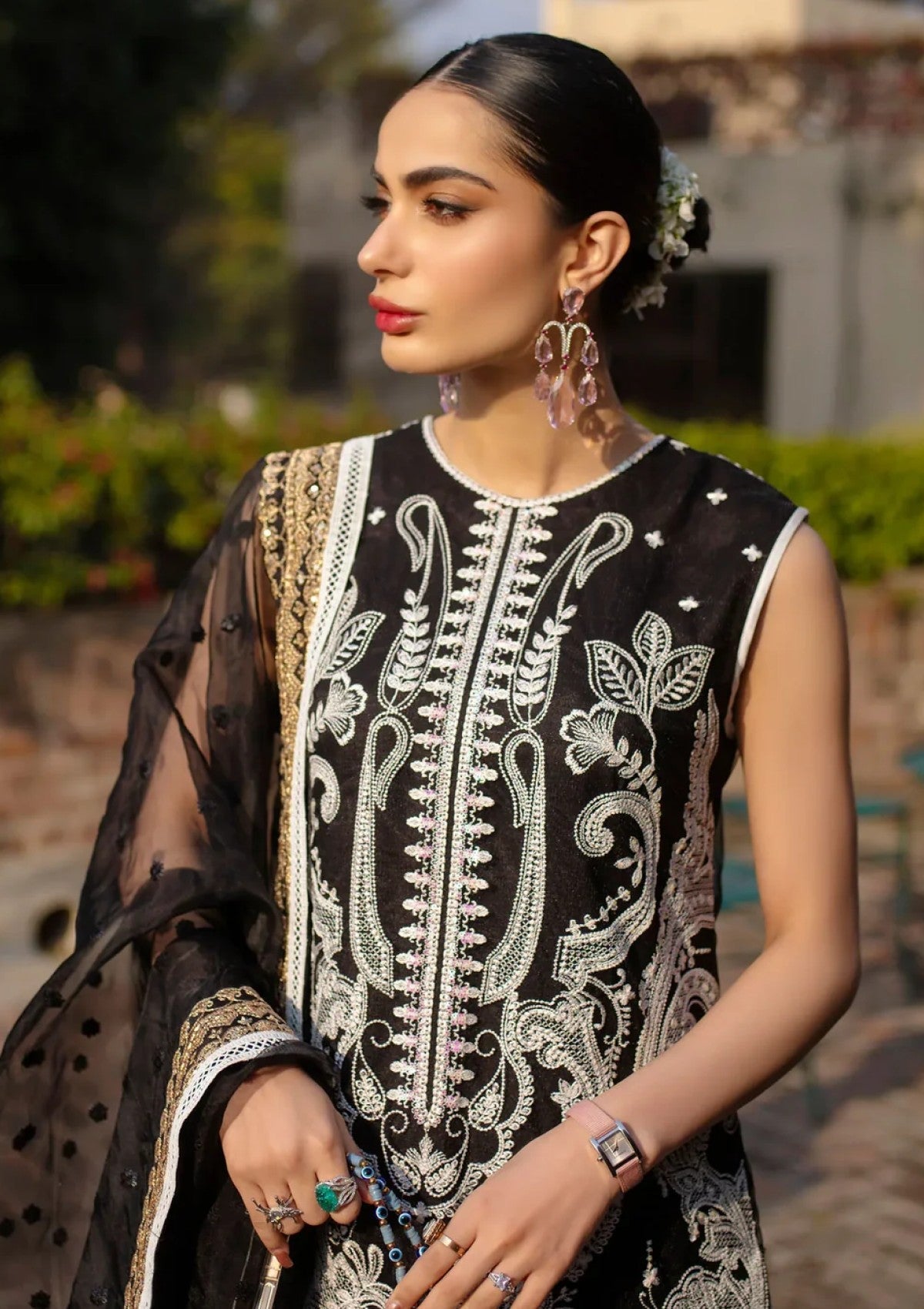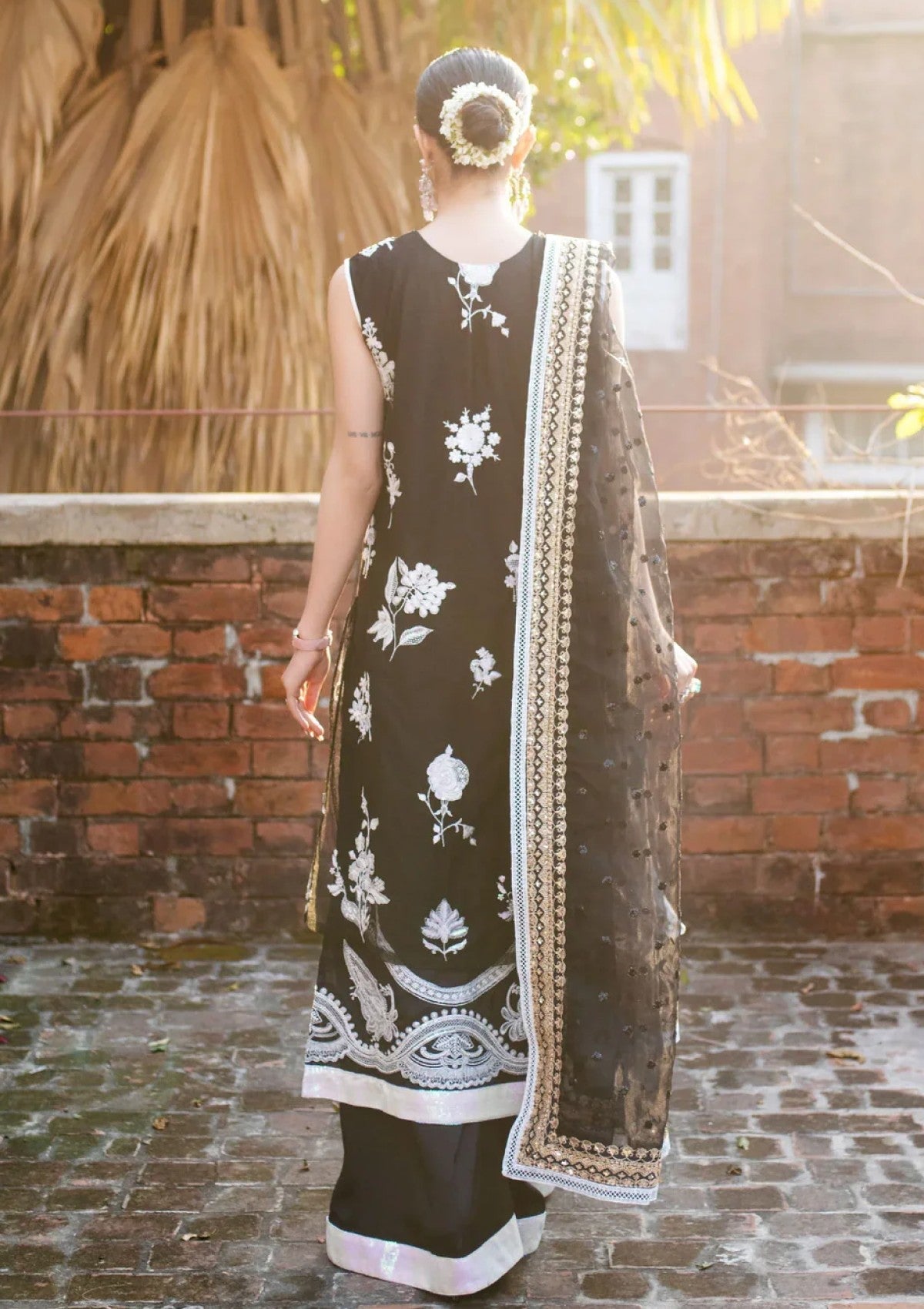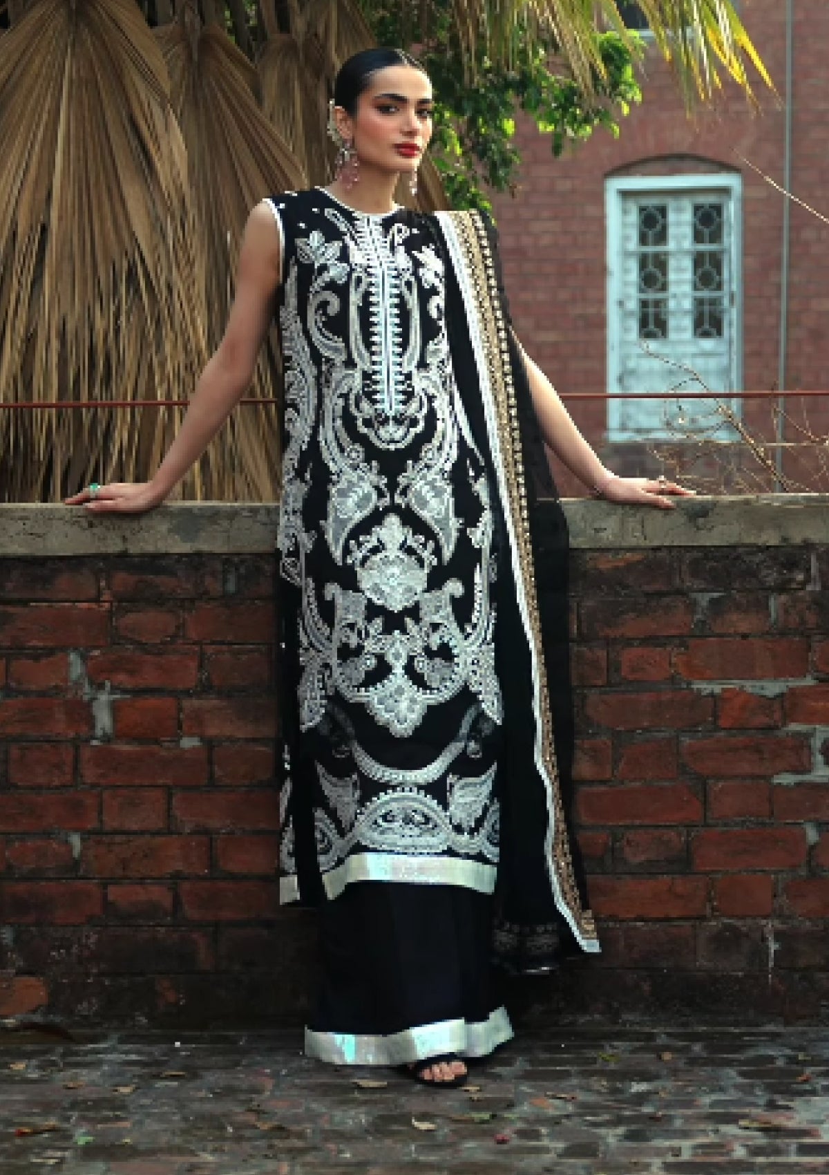 A timeless black long shirt and trouser set featuring intricate ivory thread embroidery and a sequined border. Paired with an organza dupatta adorned with a elegant gold and white border. Note: Separate sleeves ready but not attached