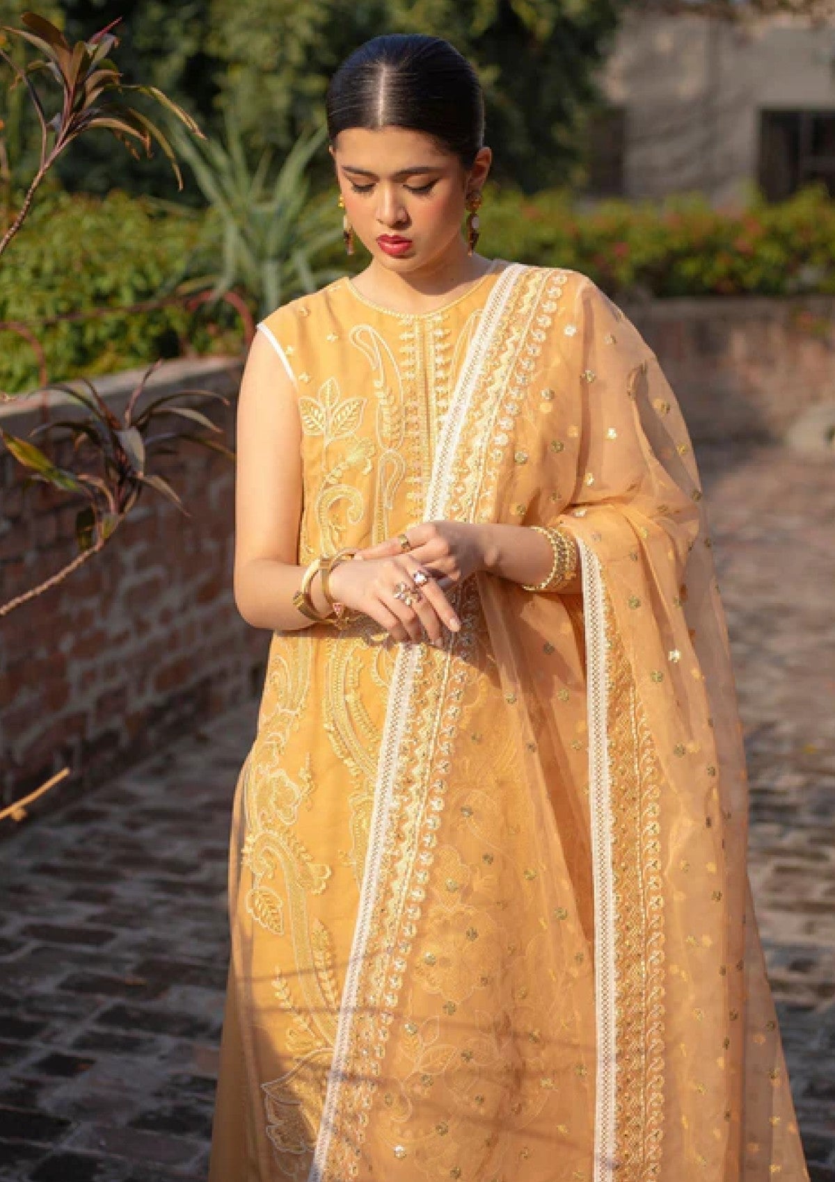 A timeless biscotti long shirt and trouser set featuring intricate ivory thread embroidery and a sequined border. Paired with an organza dupatta adorned with a elegant gold and white border. Note: Separate sleeves ready but not attached