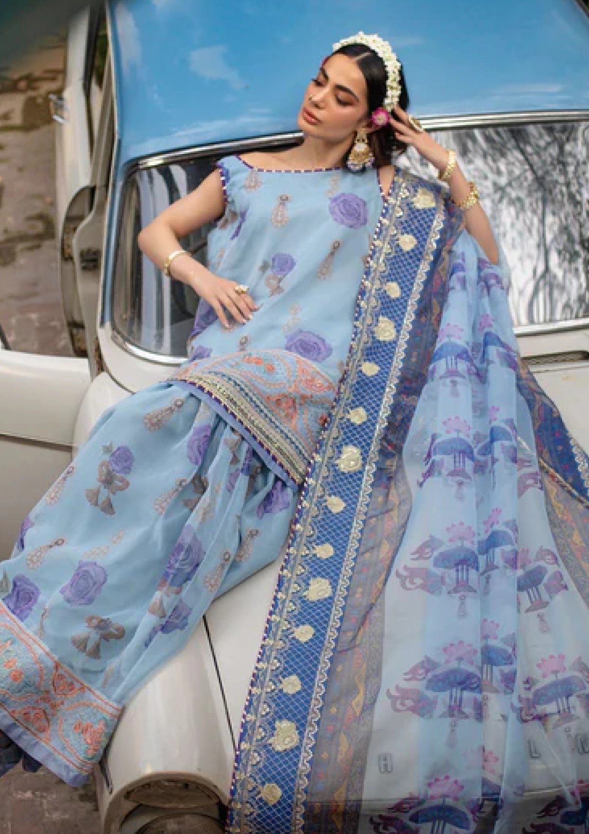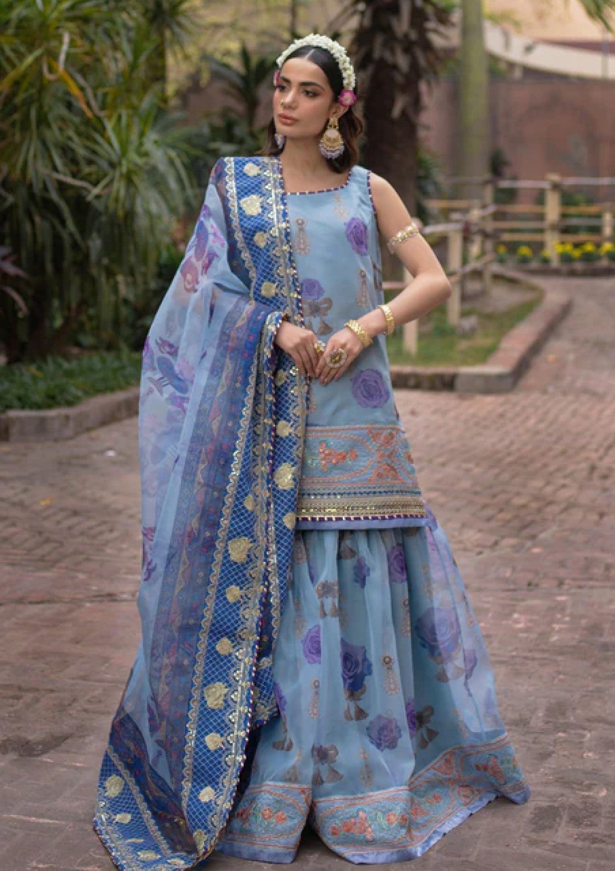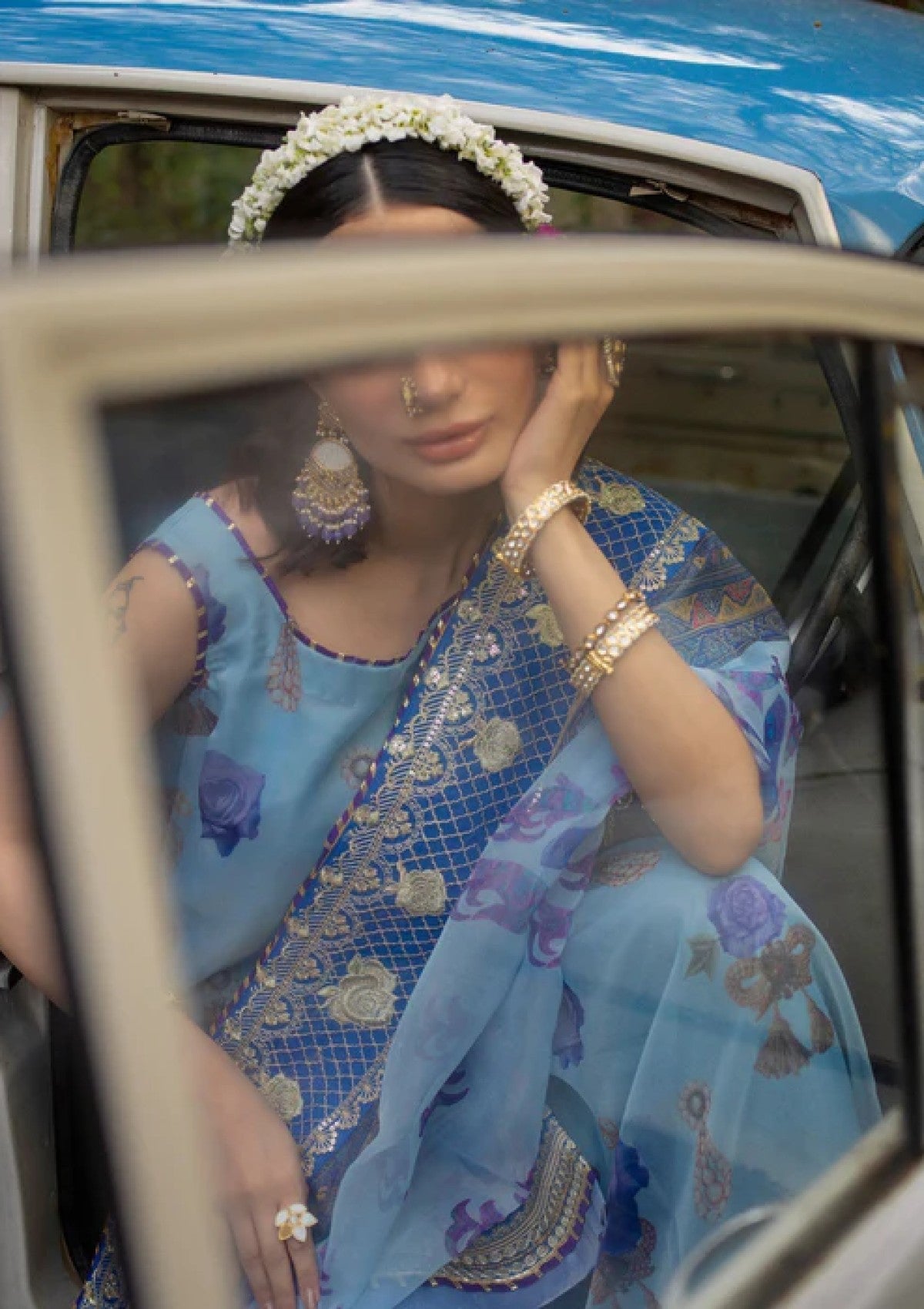 A timeless sharara set in a soothing blue hue is hand-rendered with blooming flowers. It is paired up with an embroidered dupatta with delicate motifs on the borders. Note: Seperate sleeves ready but not attached.