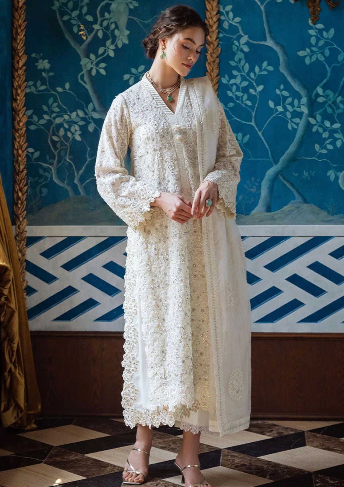 - Indulge in timeless elegance with this khaadi cotton net three-piece ensemble. The raw silk shalwar features delicate milky lace on the trouser cuffs, complementing the intricately embroidered two-layered chikankari shirt adorned with light silver sequins and pearl embellishments, and finished with scalloped borders. The pleated neckline with pearl hanging tassels and the four-sided chikankari and cutwork border dupatta complete this sophisticated look. This is a 3 pc outfit.