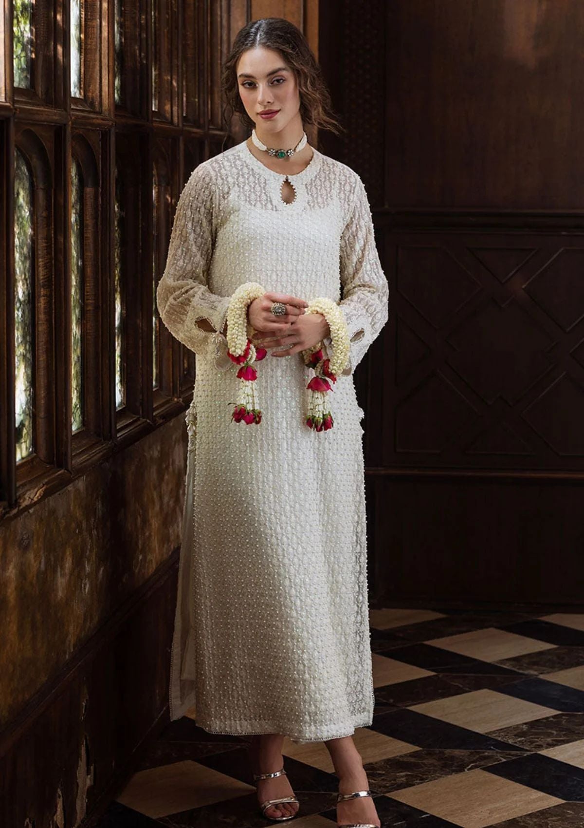 - Elevate your wardrobe in our ensemble Roya, featuring a chikankari embroidered shirt adorned with light sequins, pearl embellishments, and pearl hanging buttons with sleeve tassels. this outfit is completed with a dupatta featuring four-sided chikankari borders and fabric and pearl hangings, making it perfect for any special occasion. This is a 3 pc outfit.