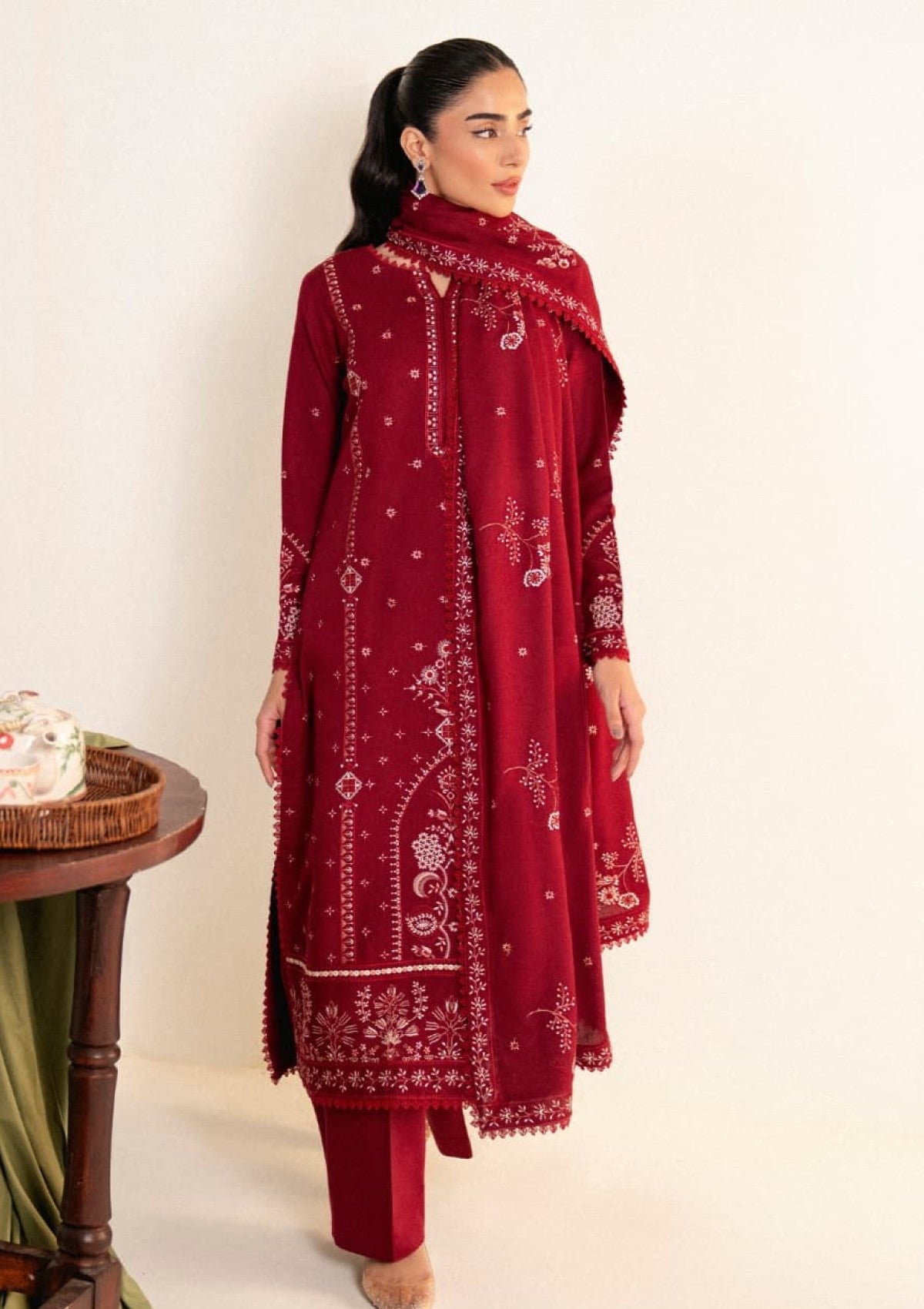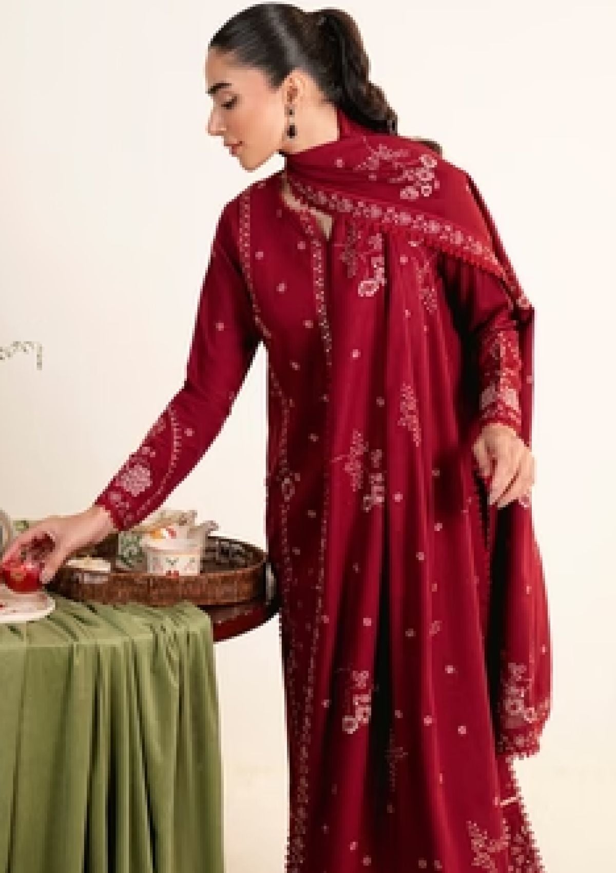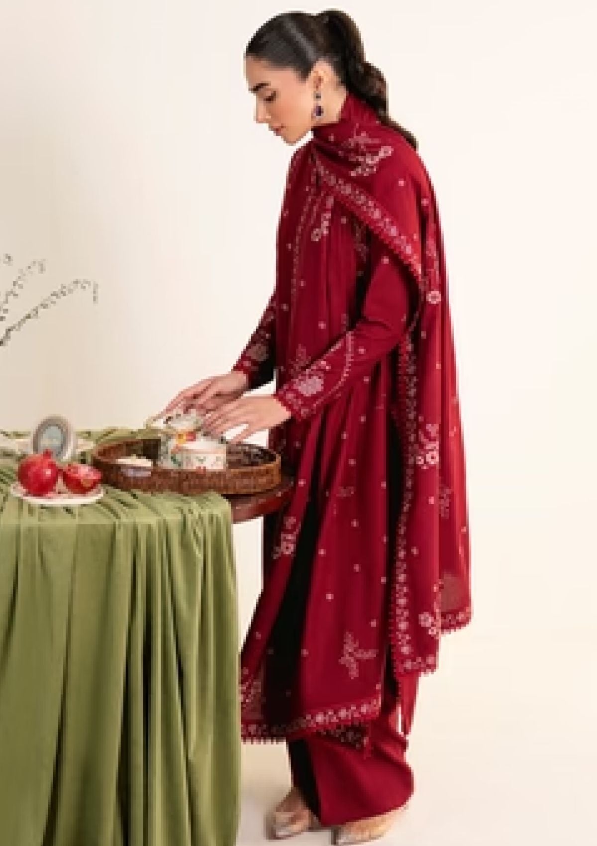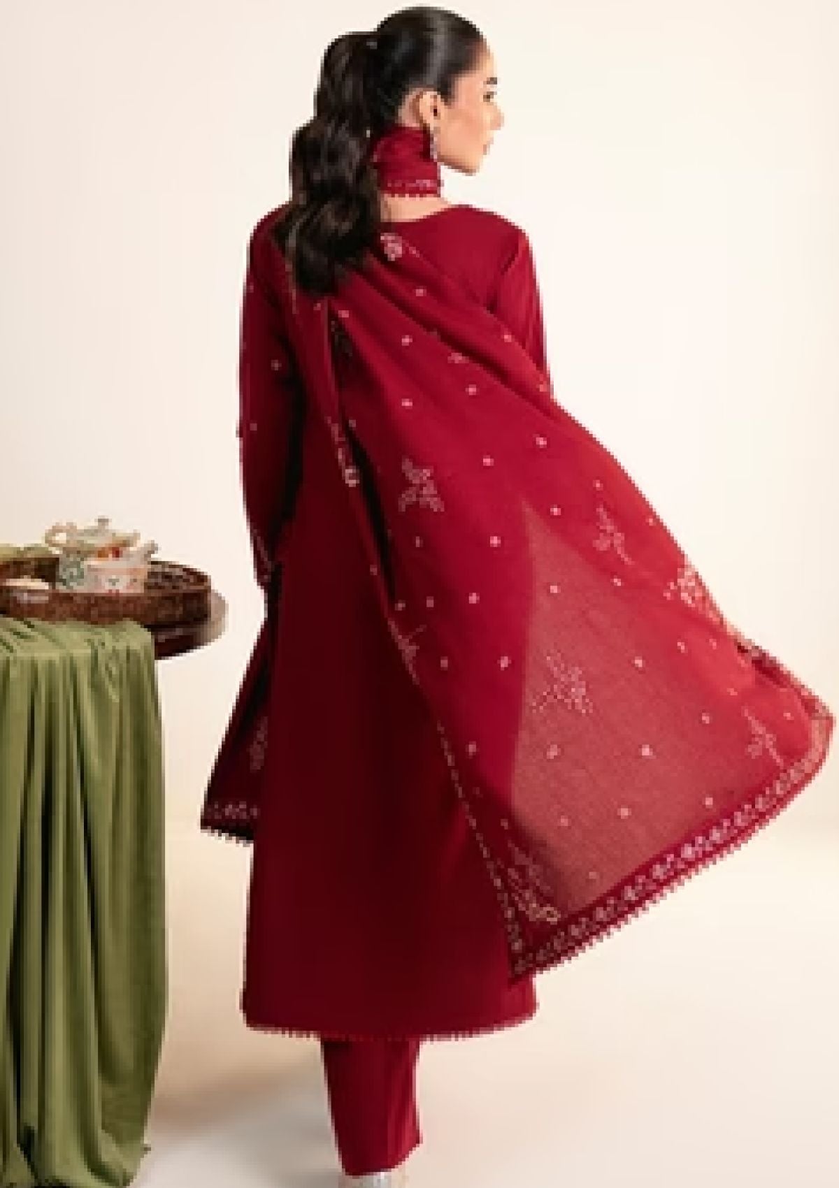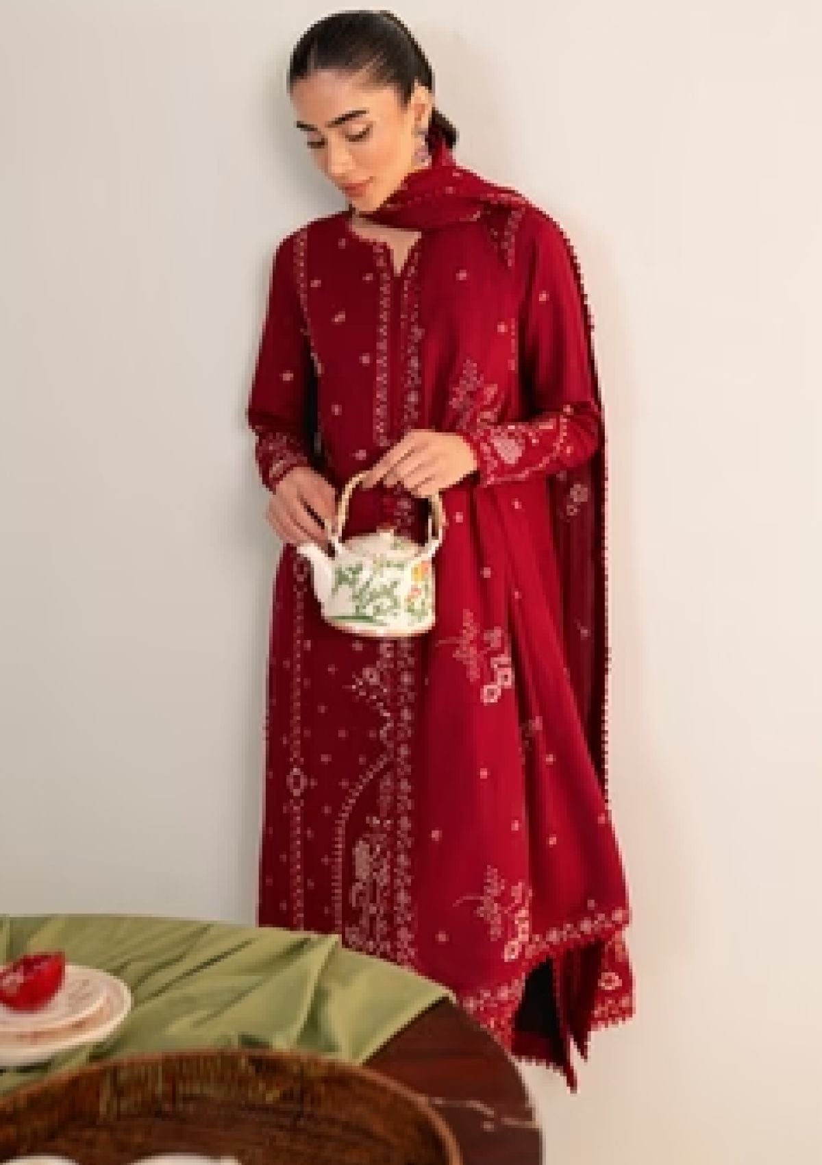 - Crimson is more than just a hue; it's an embodiment of quiet elegance and bold warmth. The deep, rich red karandi fabric serves as the perfect canvas, highlighted by delicate shades of embroidery that bring a sense of refined sophistication. The intricate design, with its soft, graceful stitches, offers a timeless beauty that captures attention without overwhelming the senses. Paired with a matching shawl, equally embroidered with the same intricate patterns, *Crimson* becomes a statement of both understated luxury and quiet strength, radiating a cozy charm perfect for the winter season.