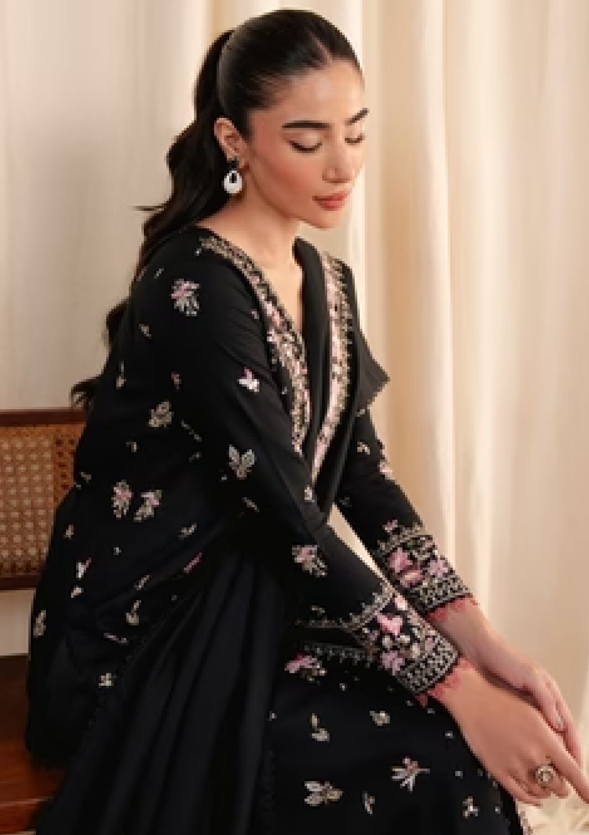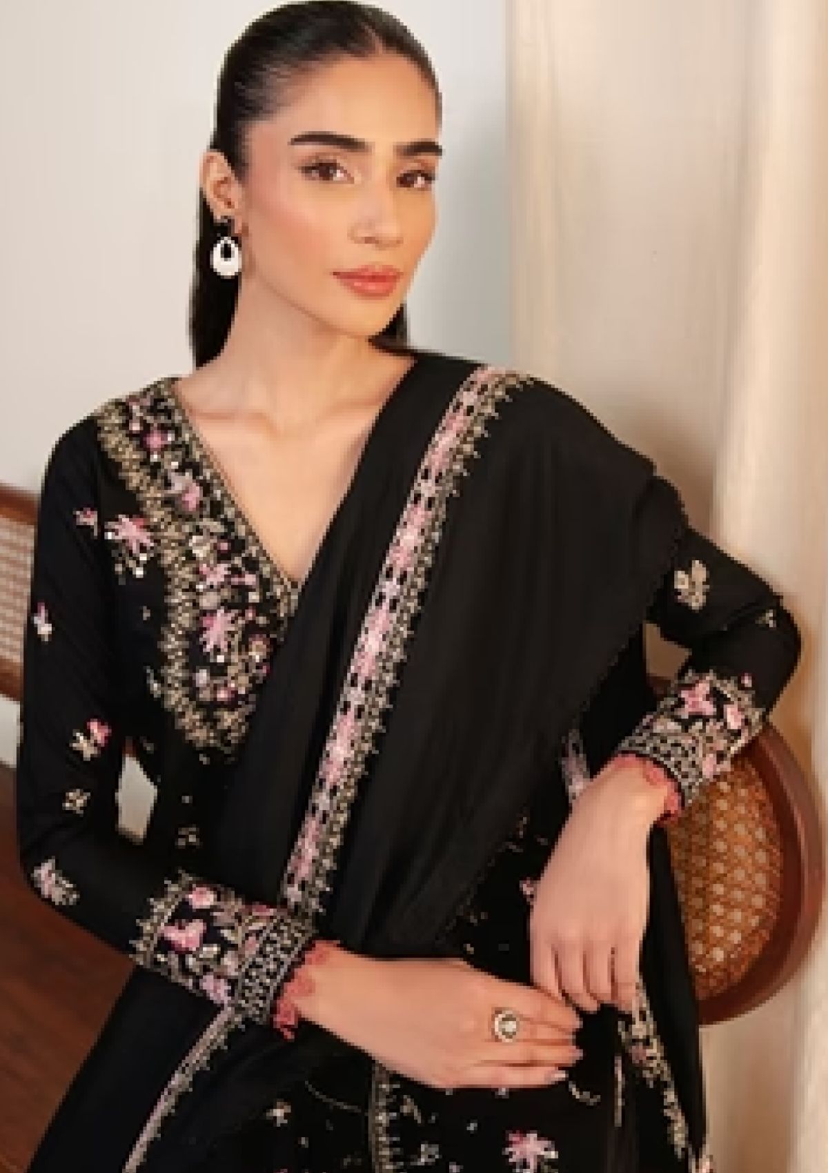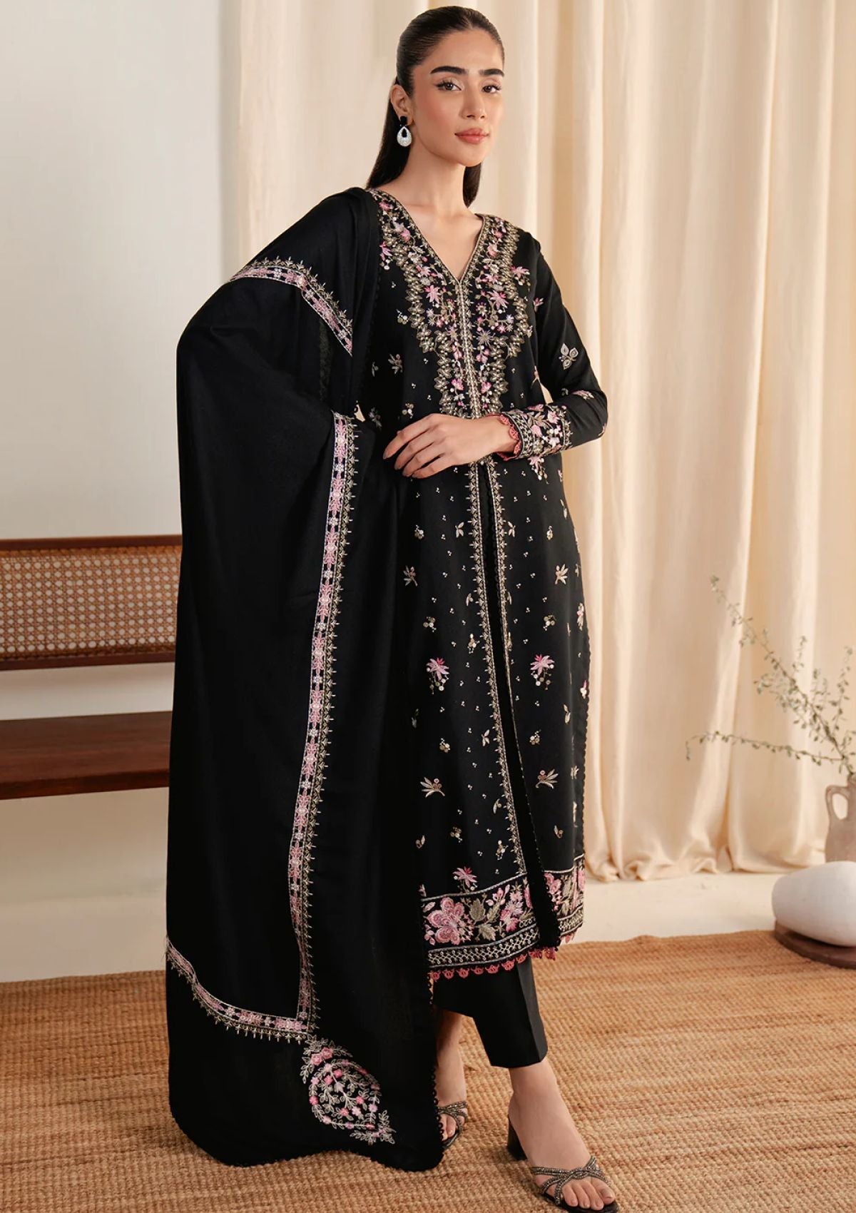 - Introducing Noir Garden from the FALL PRET'24 collection, an exquisite black karandi outfit that redefines elegance. The shirt is adorned with intricate multicolored embroidery featuring delicate flowers and enchanting birds in flight, creating a captivating design that celebrates the beauty of nature. Paired with a luxurious black karandi shawl, intricately embroidered with stunning detail and perfectly finished borders, this ensemble is an absolute masterpiece. Perfect for winter gatherings, Noir Garden combines warmth, sophistication, and artistic charm to make a bold yet graceful statement.