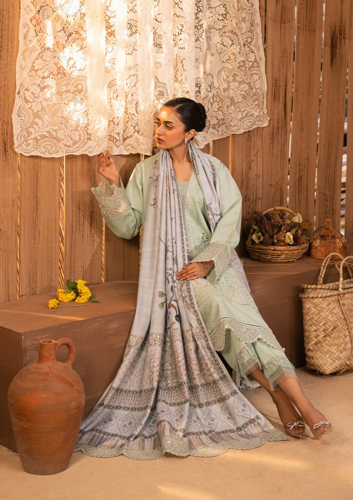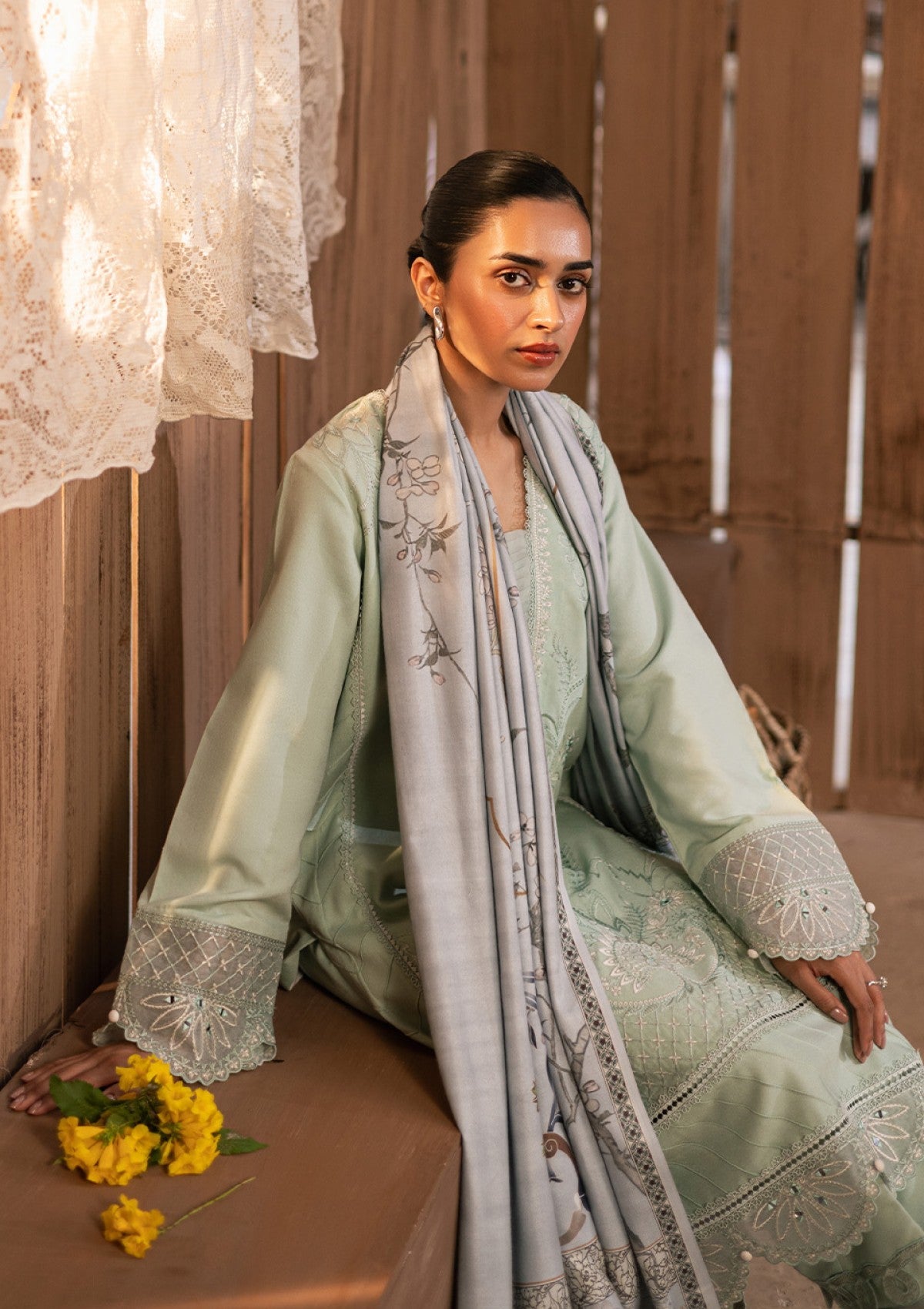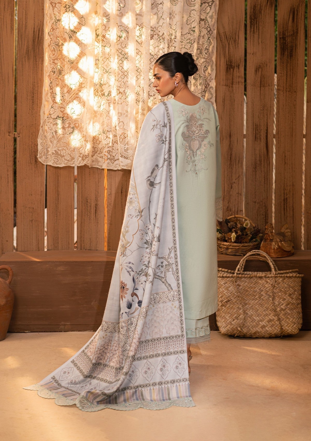 Behold "AYLA" a sartorial marvel that epitomizes sophistication and artistic finesse. Its glacial green hue serves as a captivating canvas, meticulously adorned with intricate embroidery depicting ivory floral in a state of enchanting bloom enhanced with mirror work detailing, paired with tonal detailed culottes. The piÃÂèce de rÃÂésistance lies in the meticulously etched borders, each thread a testament to unparalleled craftsmanship, adding a uniquely exquisite dimension to the shirt. Accompanied by an impeccably crafted digital printed woolen shawl, adorned with complementary embroidered pallus enhanced with mirror work.This ensemble transcends mere attire to become a veritable masterpiece of wearable art. "Ayla" is a symbol of refined taste and discerning elegance, a testament to the wearer's appreciation for beauty and mastery in every meticulous detail.