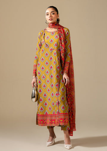 A stylish printed outfit featuring Olive green long kameez with intricate red and white motifs, paired with a matching red-bordered printed dupatta and fitted trousers. Perfect for an elegant stylish & traditional look.