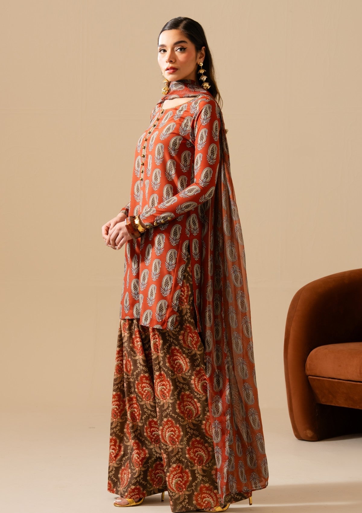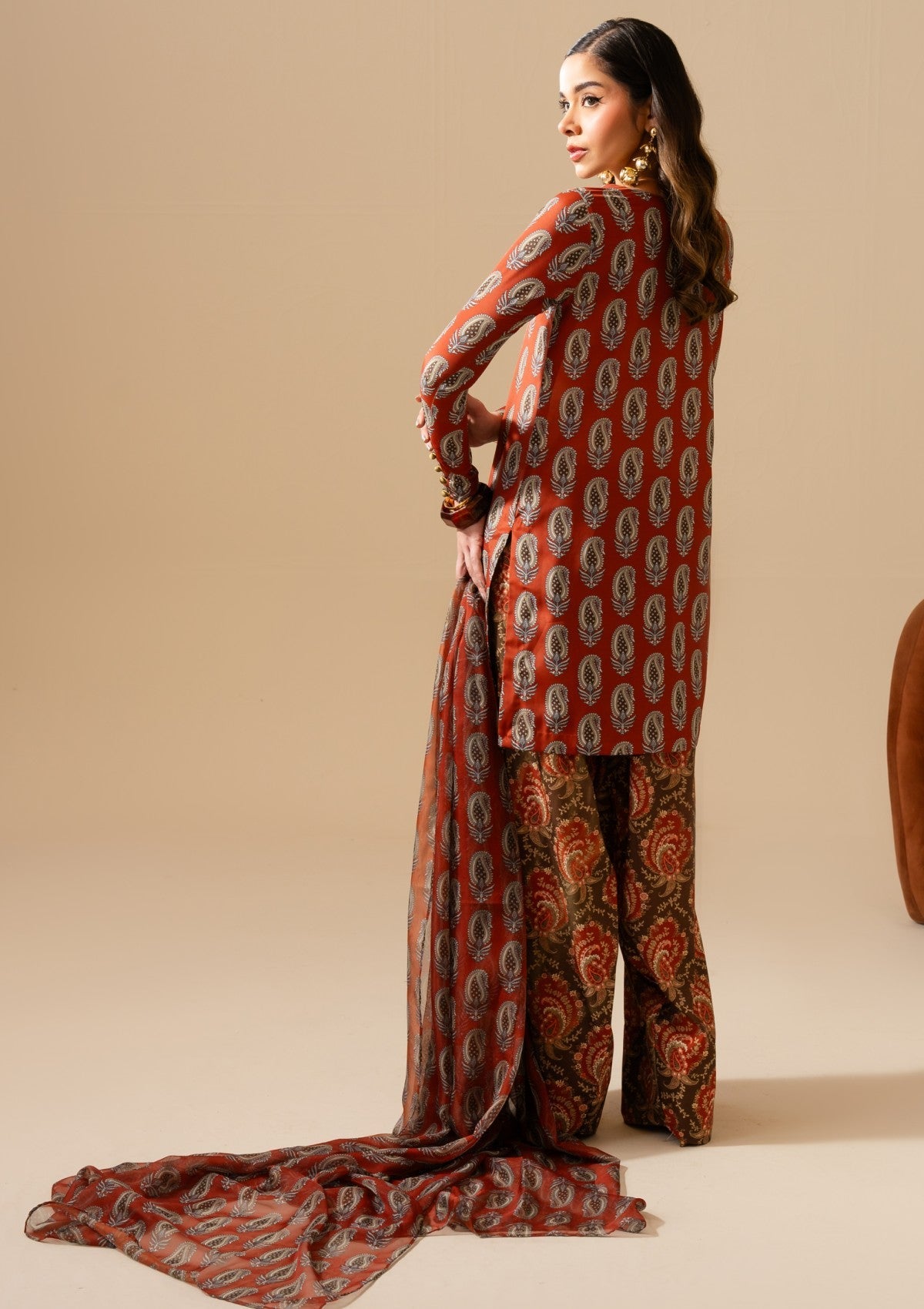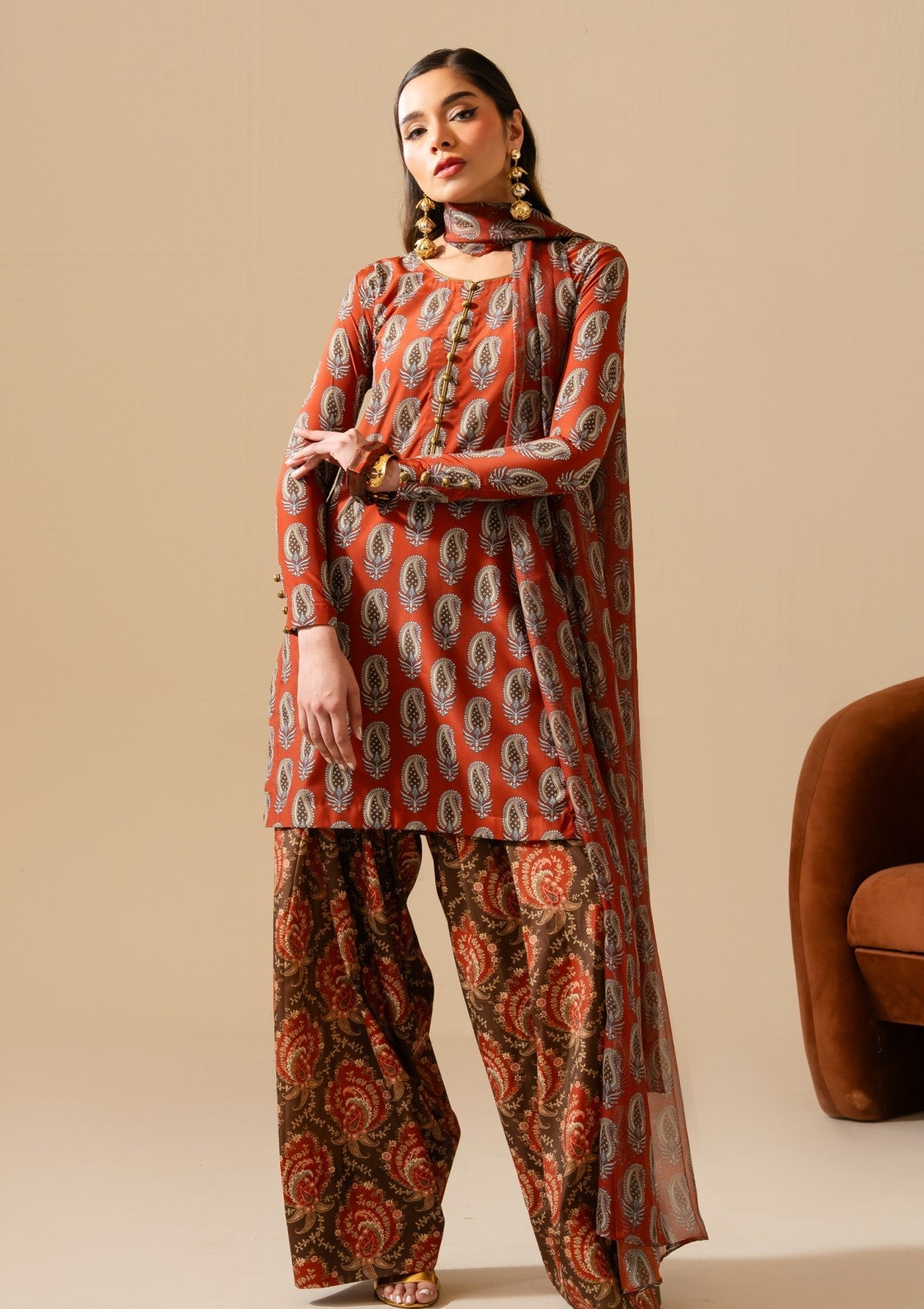 This stunning outfit featuring delicate printed motifs and a striking contrast of patterns. The flowy silhouette, shalwar, and shirt matching dupatta making effortless grace, making it a perfect fusion of tradition and modernity.