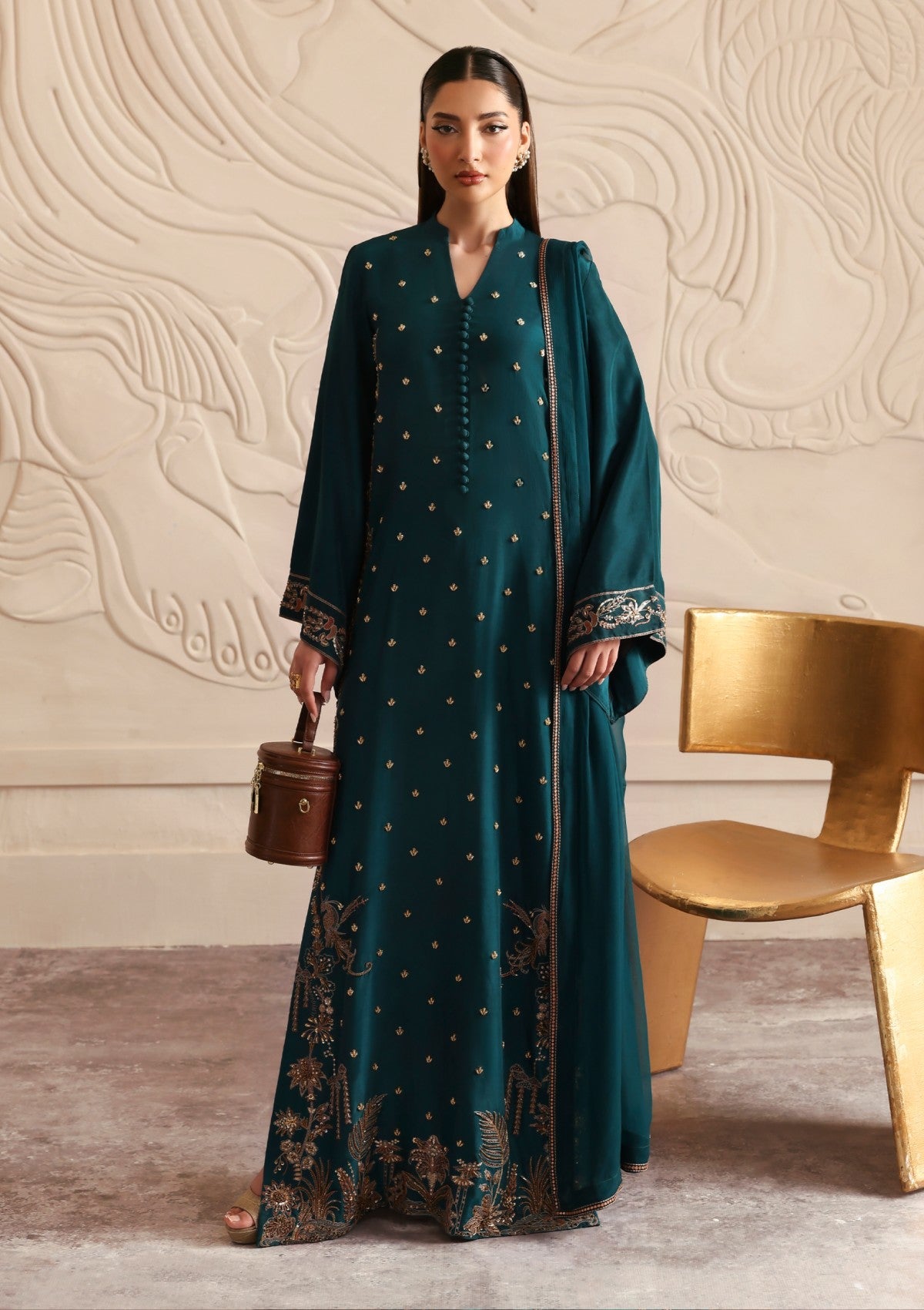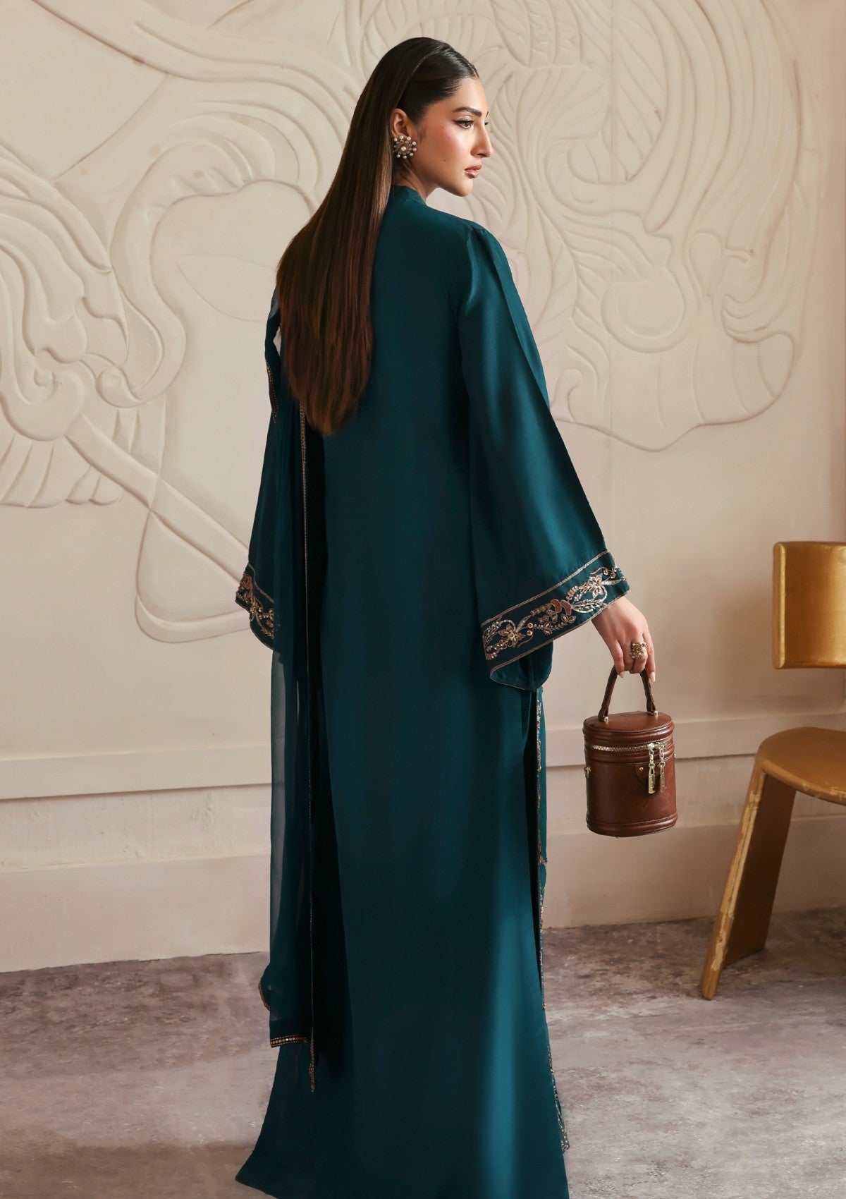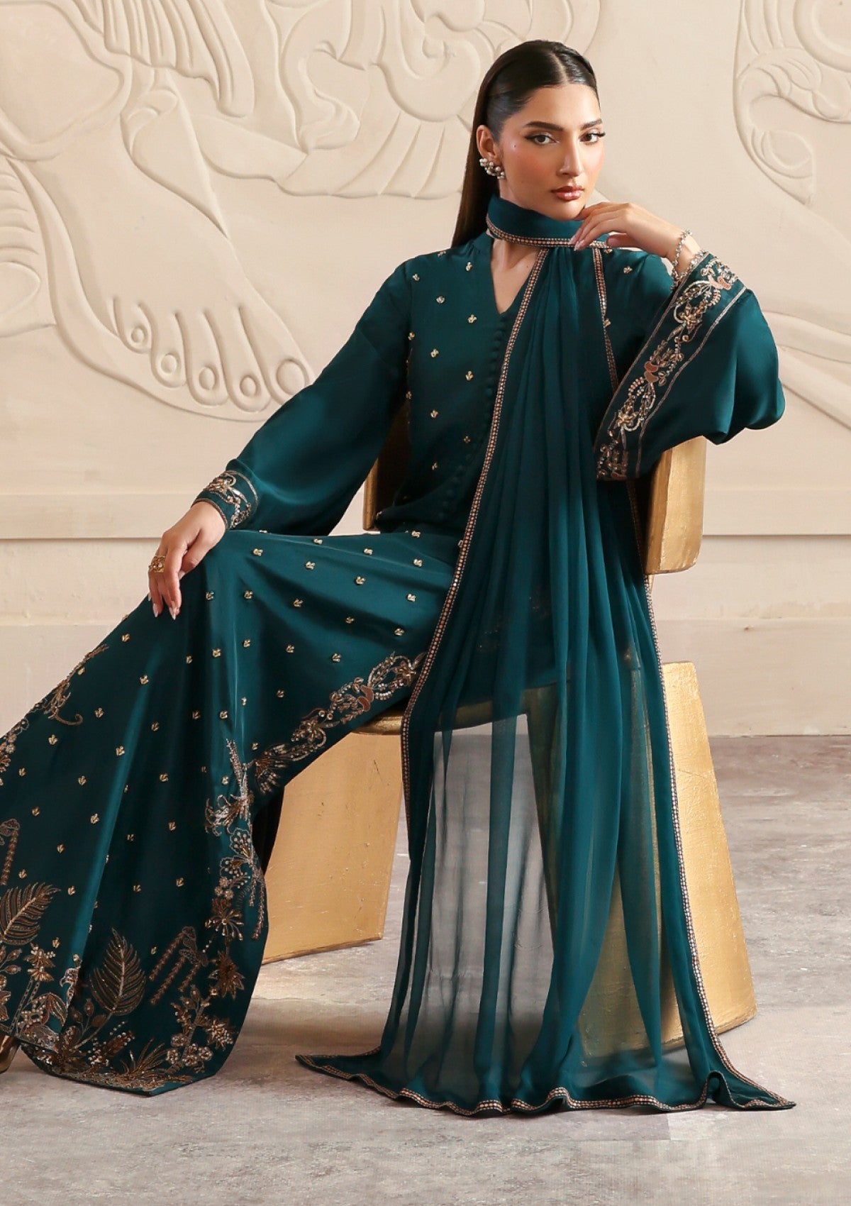 LONG TEAL SHIRT RICHLY EMBROIDERED AND EMBELLISHED WITHFLARED SLEEVES, PAIRED WITH CIGARETTE PANTS AND ACHIFFON DUPATTA FINISHED WITH EMBROIDERED BORDERS.