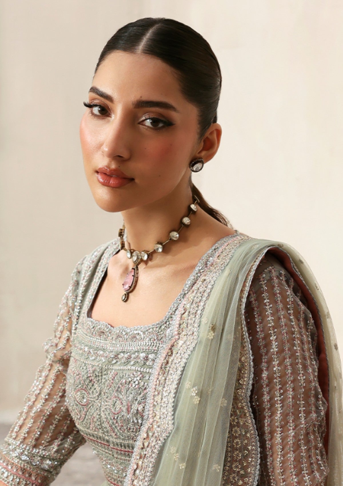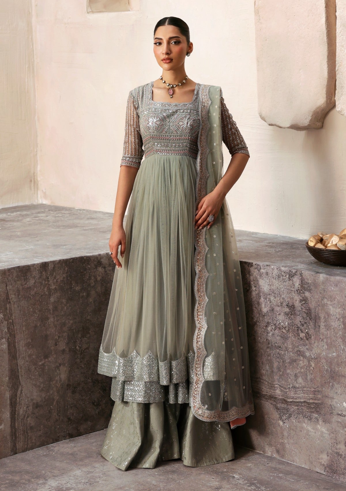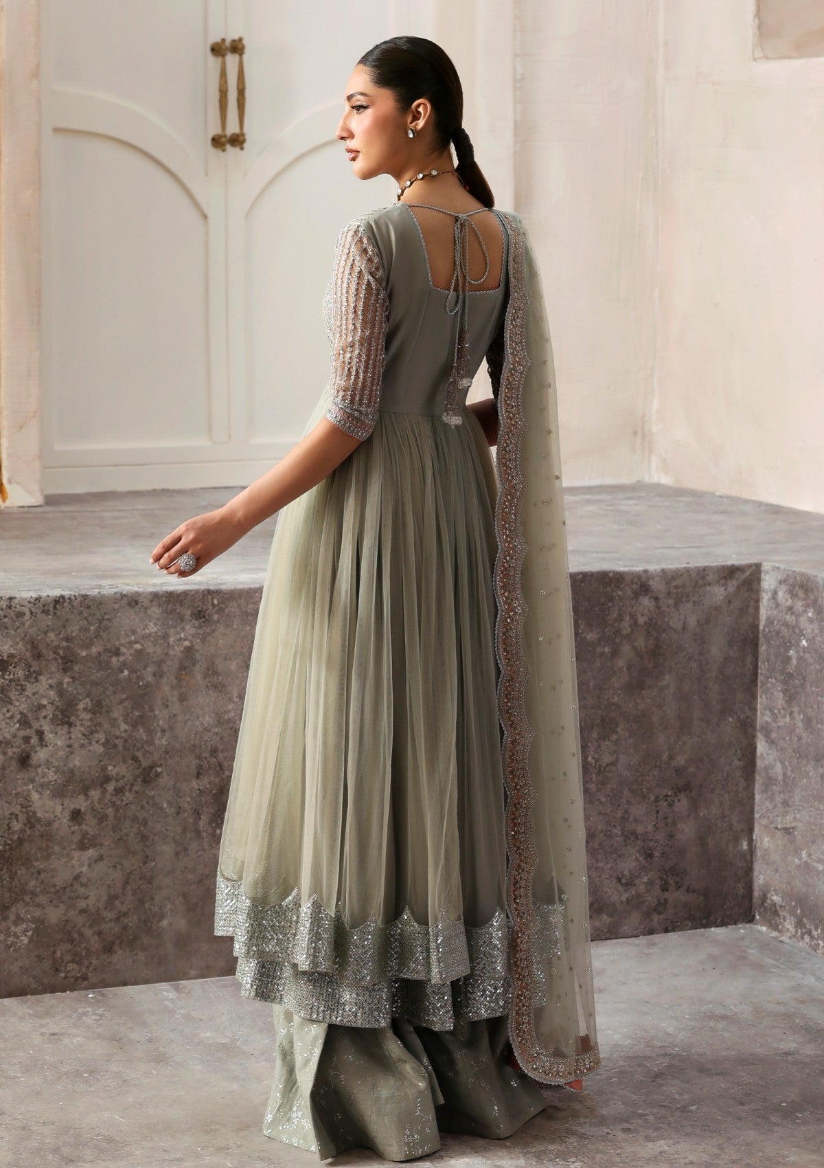 ASH GRAY NET PISHWAS WITH INTRICATE SEQUIN EMBROIDERY ANDDOUBLE SEQUIN BORDERS, PAIRED WITH RAW SILK FOIL-PRINTEDTROUSERS AND AN EMBROIDERED SCALLOPED DUPATTA FOR AGRACEFUL FESTIVE LOOK.
