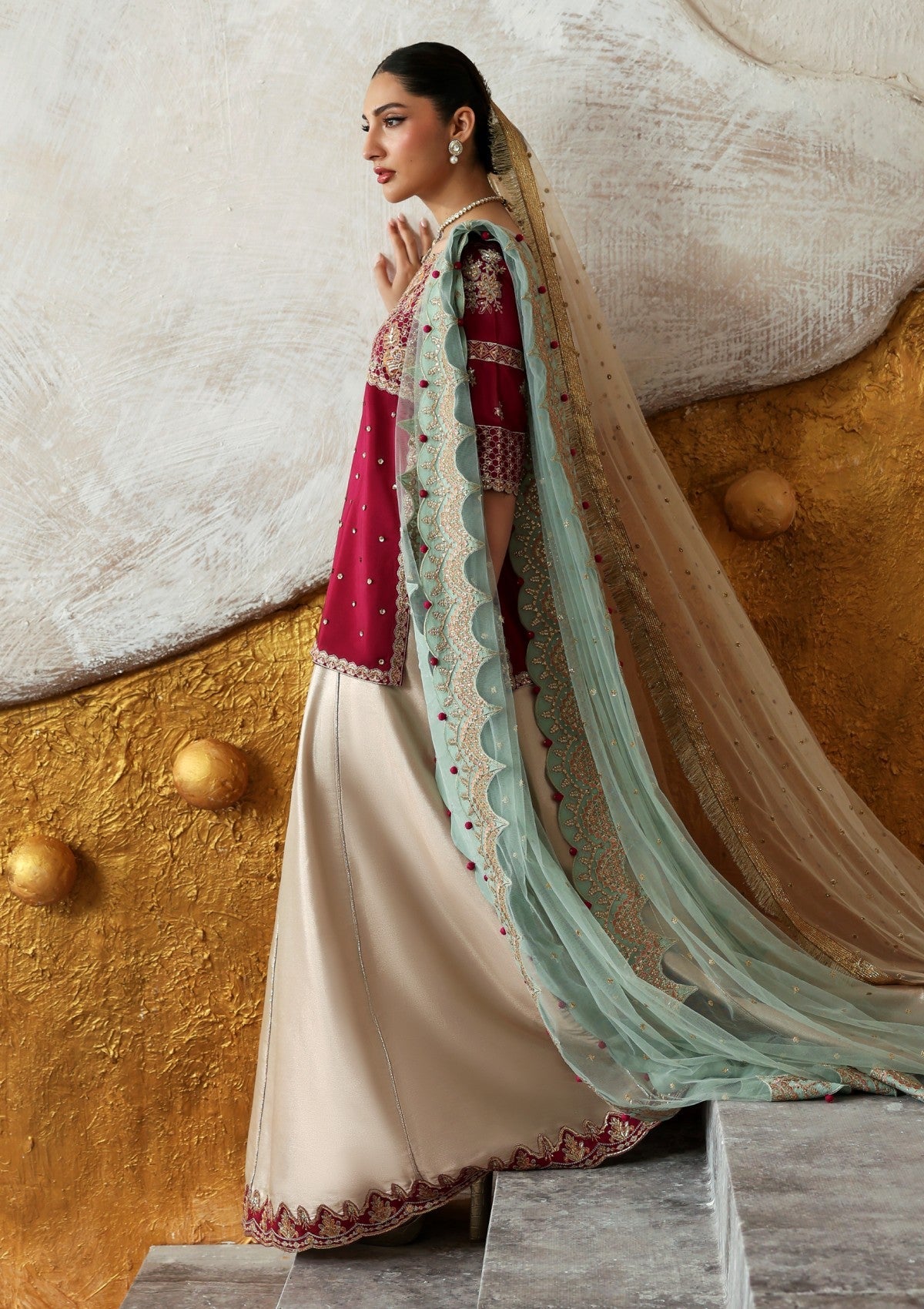 MAGENTA EMBROIDERED SHORT SHIRT ADORNED WITH TASSELS,PAIRED WITH IGHT GOLD TISSUE LEHNGA FEATURING MATCHINGTASSEL ACCENTS. STYLED WITH A CONTRASTING AQUA NETDUPATTA WITH SCALLOPED EMBELLISHED BORDERS.