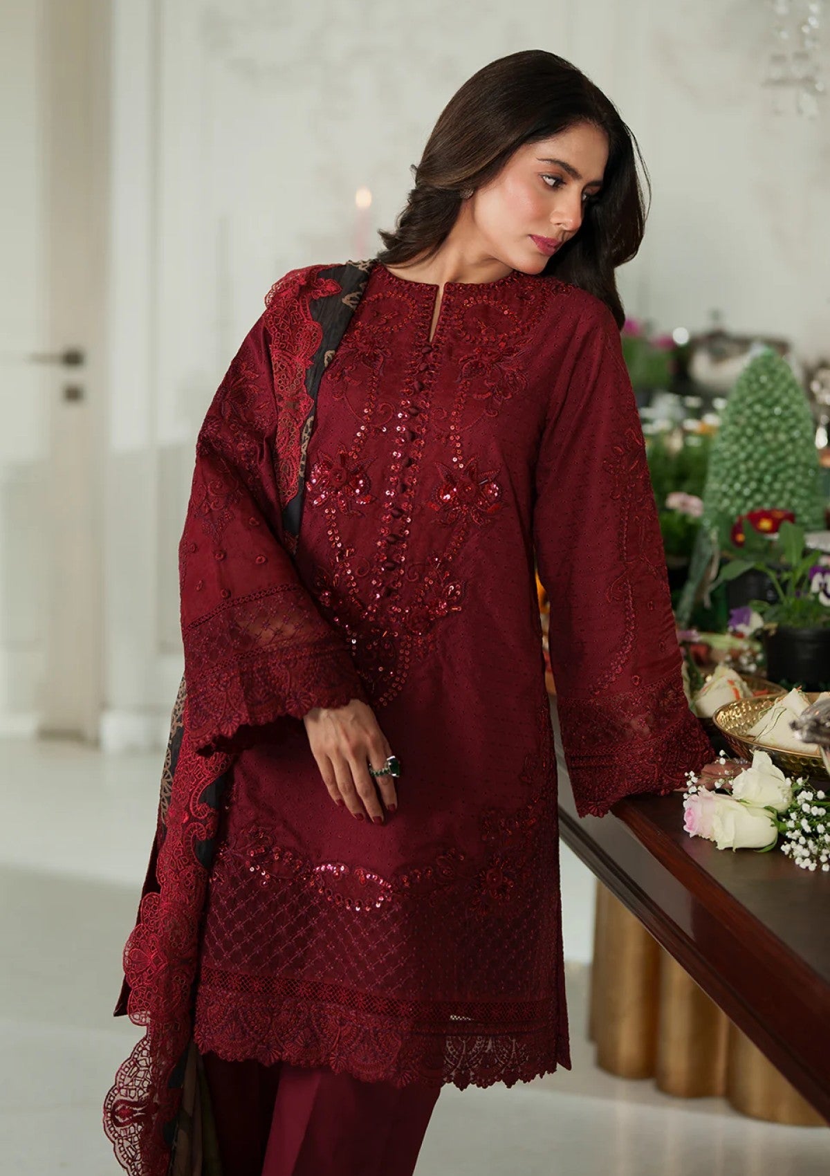 The first reveal from BelleAme'2025 is bright, beautiful and unforgettable. Introducing âÃÂÃÂRougeâÃÂàpresented in a scarlet red hue that radiates serenity and elegance. Delicate embroideries enhanced with sequins, beads, crystals and 3D French knots, rendered in silk threads of scarlet and maroon adorns the fabric with intricate motifs inspired by the beauty of nature. The shirt's borders exhibit meticulous craftsmanship, this kurta style shirt can be paired with tonal pants and a contrasting digital print dupatta featuring embroidered details reminiscent of swirling garden blossoms. âÃÂÃÂRougeâÃÂàoffers wearers the opportunity to embody elegance and sophistication in every step, making it a perfect choice for those seeking understated yet refined sartorial expressions.