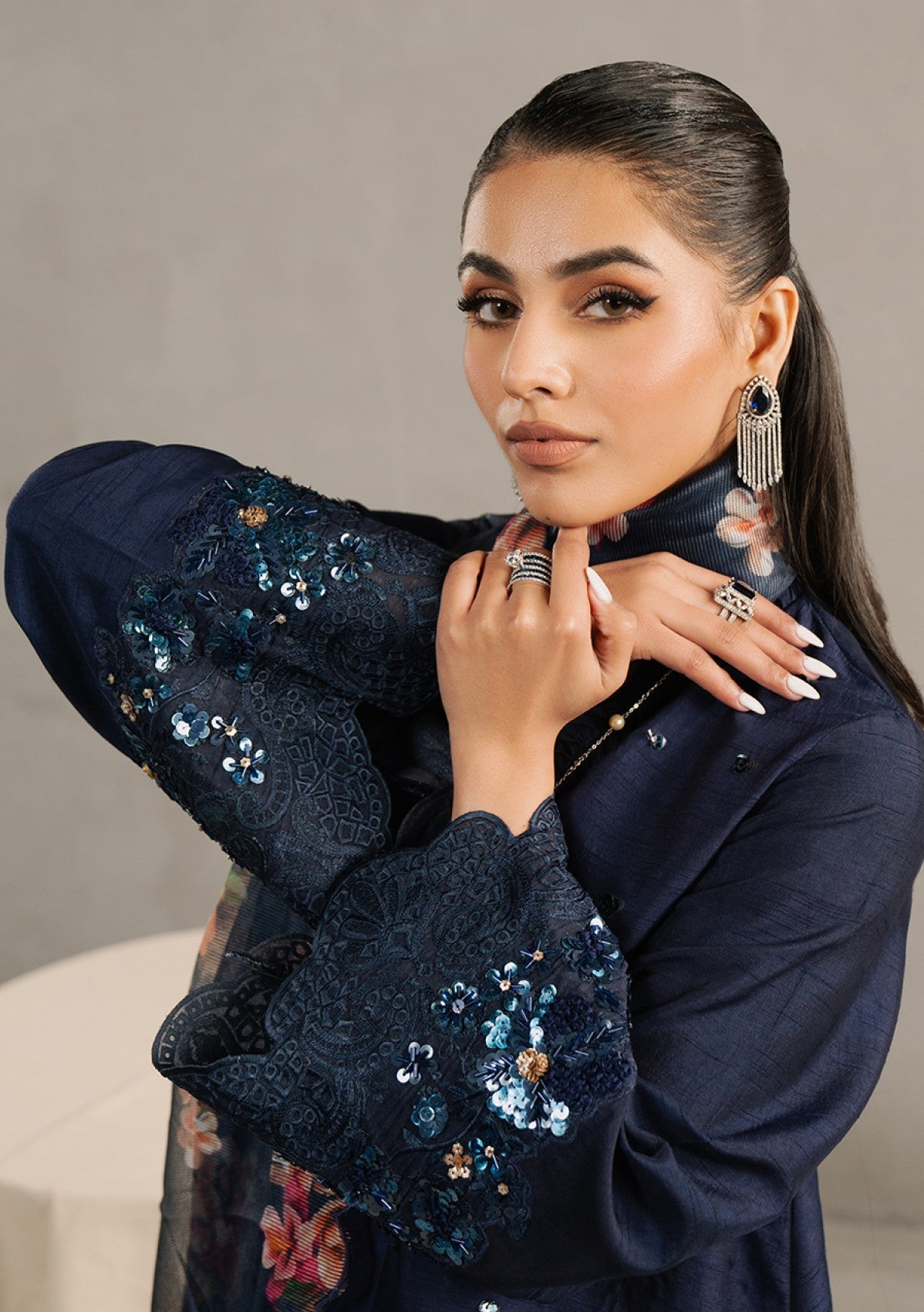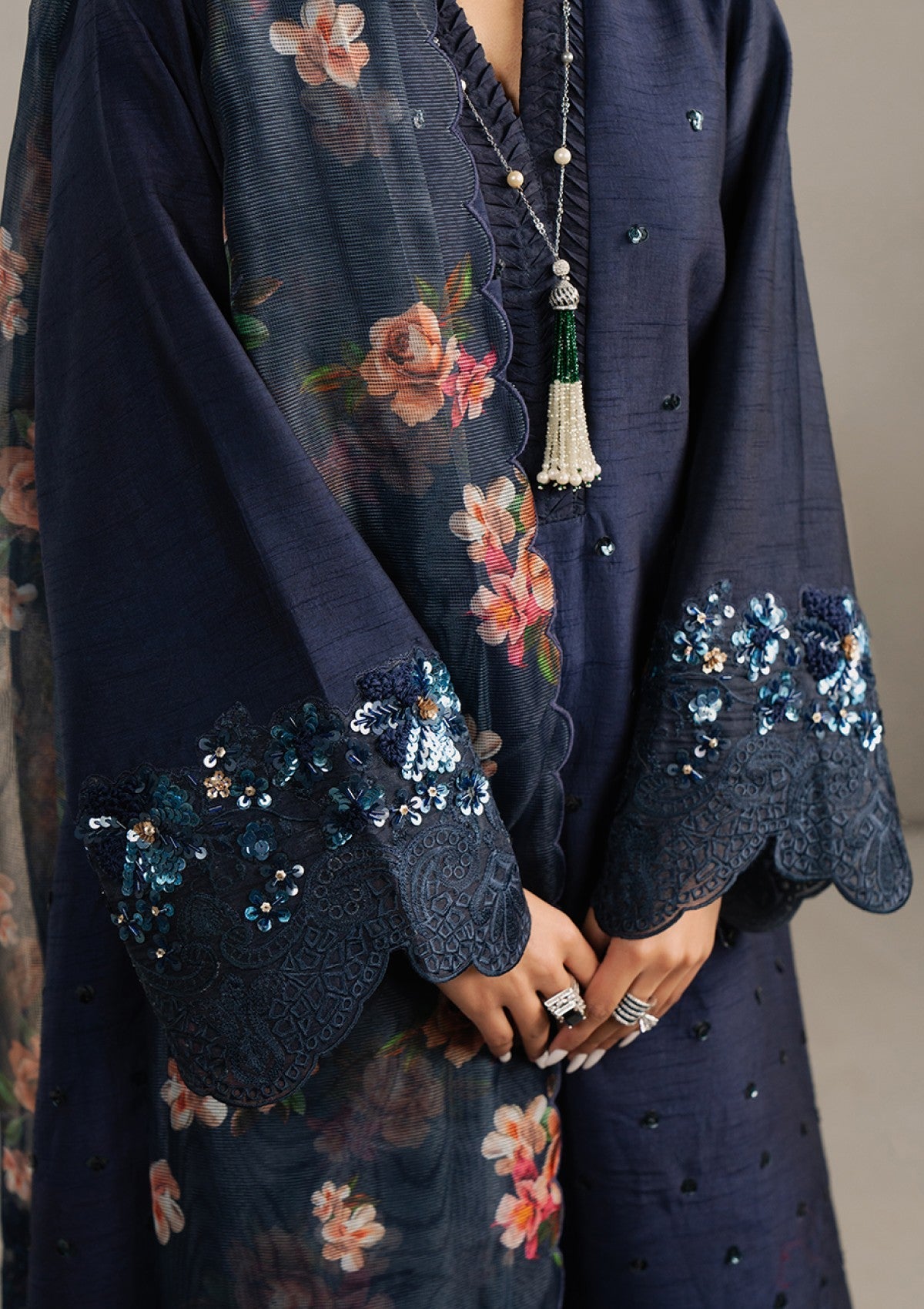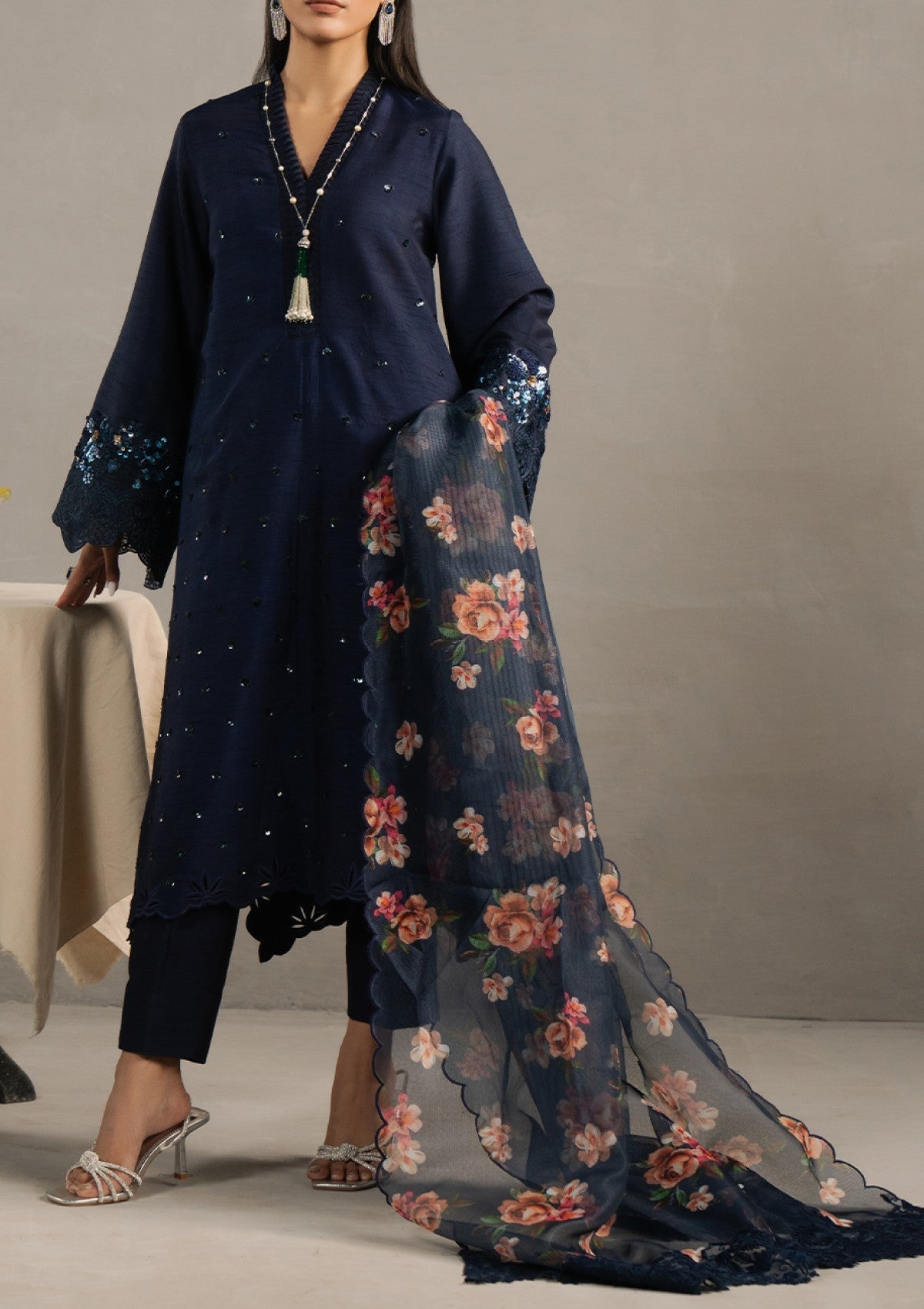 Step into elegance this season with our Midnight Blue Raw silk ensemble, featuring a sequins drop corner embroidered cut-work shirt with embroidered bell sleeves adorned with hand embellished details utilizing beads, crystals, sequins and thread work embroidery, complemented by straight raw silk pants that enhance simplicity, and a beautifully digital printed embroidered dupatta with scalloped borders that elevate the entire look.