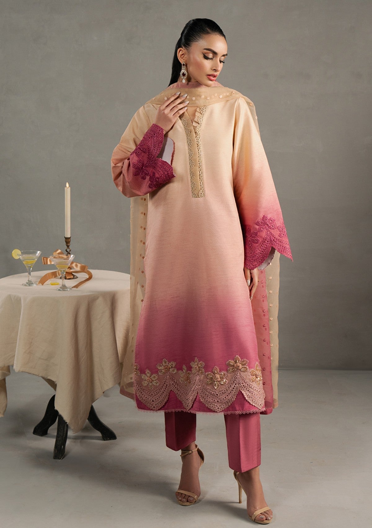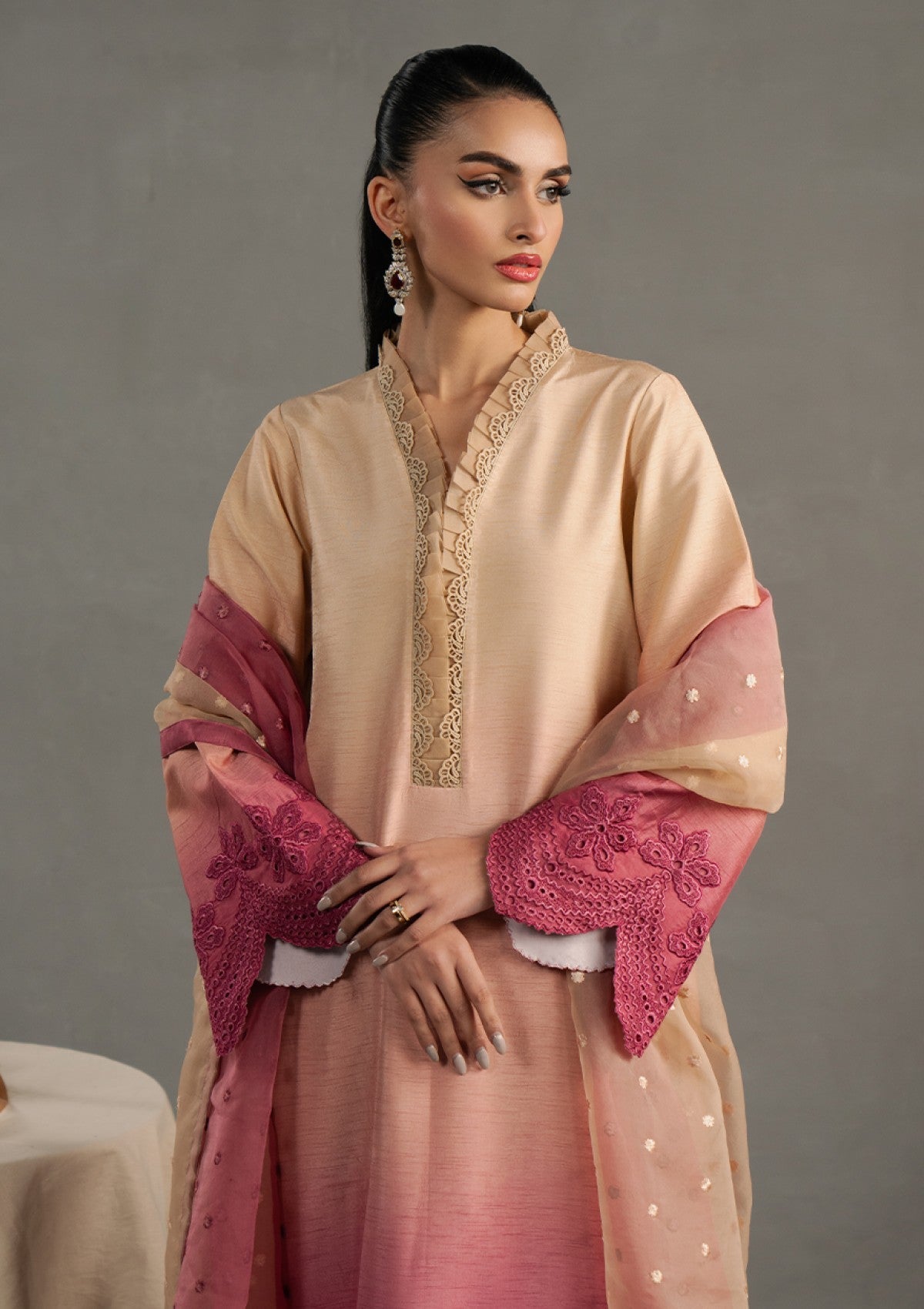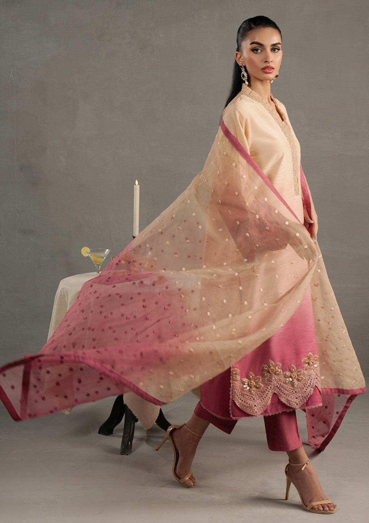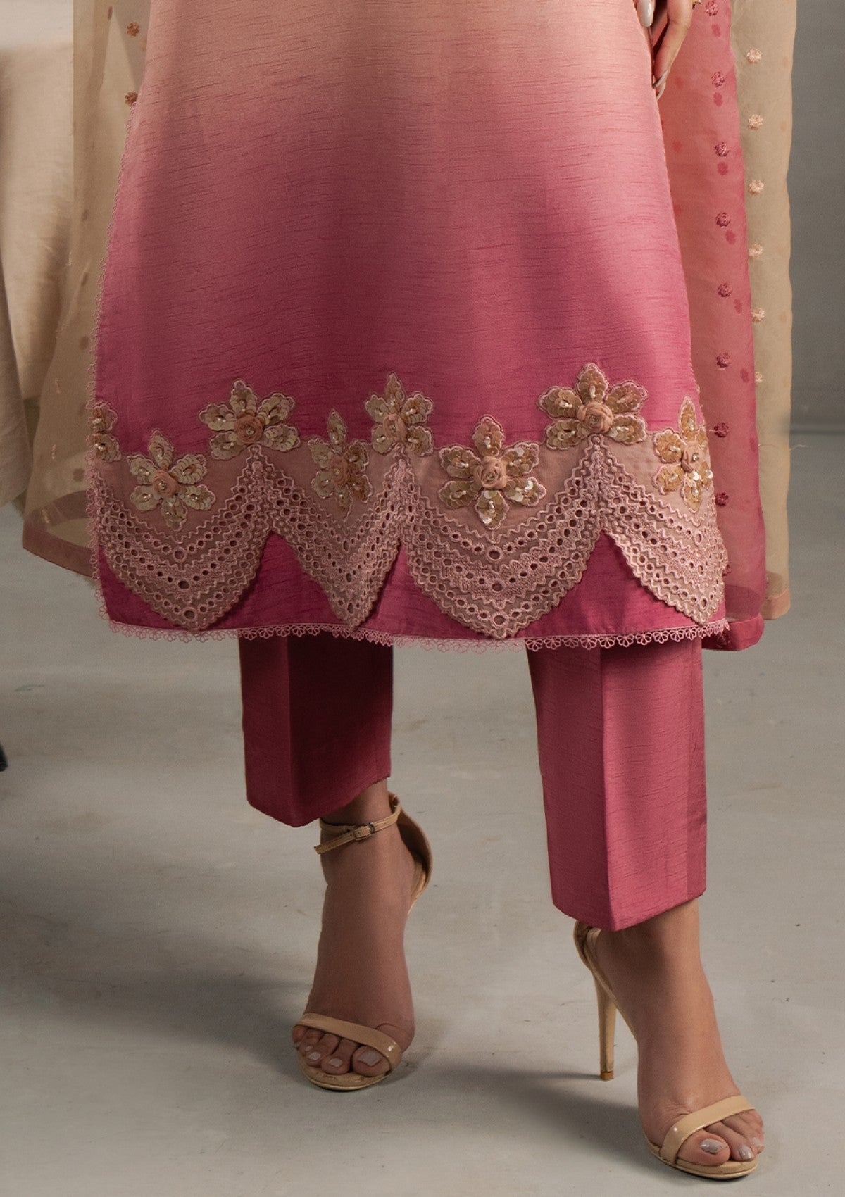 This opulent masterpiece, enveloped in an exquisite salmon peach hue, redefines the essence of luxury. The shaded shirt, fashioned from the finest raw silk cascades with an ethereal elegance, adorned with resplendent gold threadwork, dazzling sequins, and intricate 3D rosettes, each meticulously crafted floral motif exemplifies unrivaled artisanal mastery, creating a tableau of timeless grandeur. The ensemble is further elevated by a meticulously tailored trouser, and an impeccably shaded draped organza dupatta, sprinkled with a lavishly intricate embroidered flowers. Designed for the most discerning clientele, this design exudes feminine charm and playful allure, making it the perfect choice for sophisticated daytime celebrations.