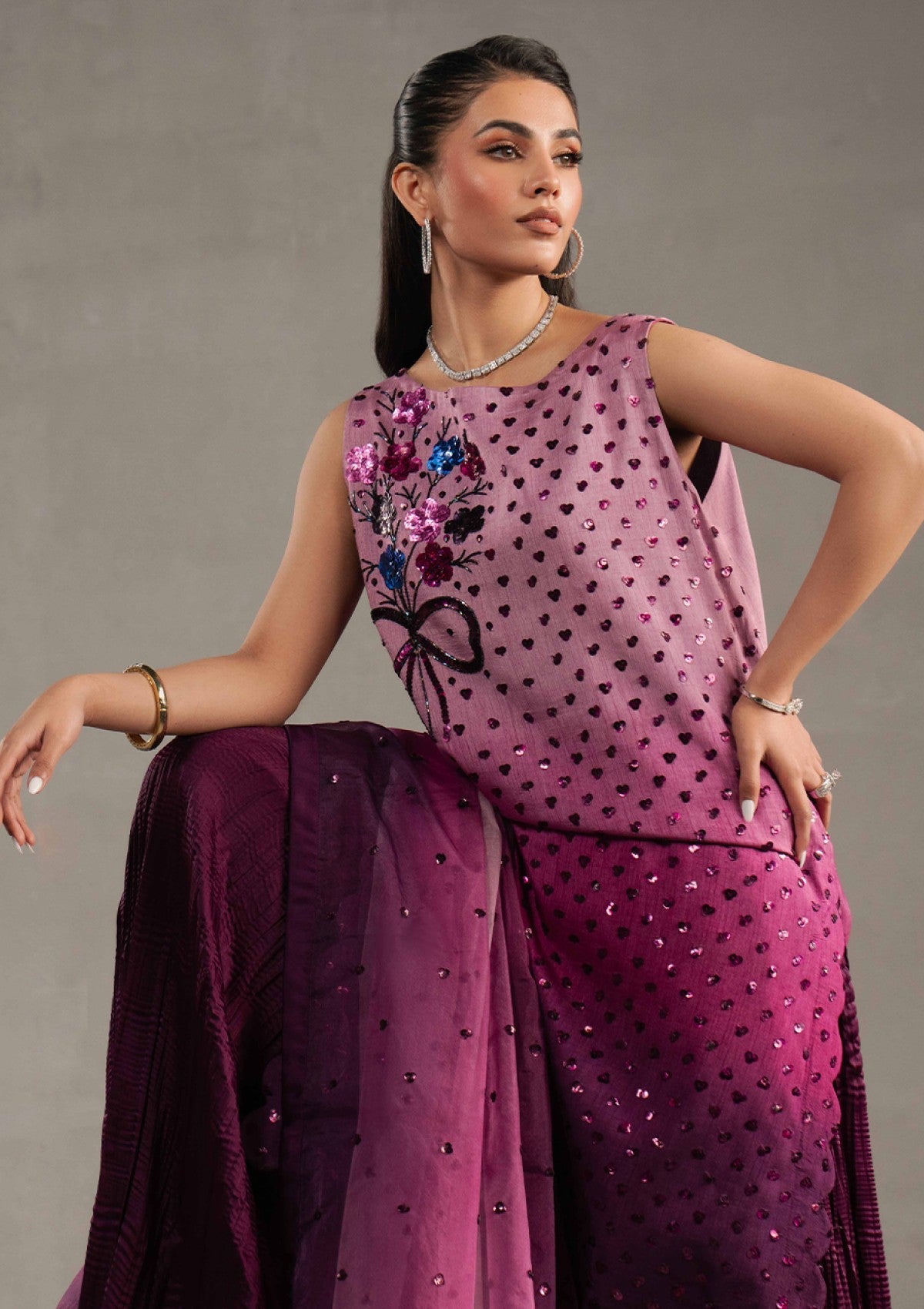 This masterful creation, meticulously hand-embellished, is crafted from the finest ethereal fabrics in shaded mulberry hues that evoke pure sophistication. The enchanting short shirt silhouette, adorned with opulent mulberry sequins accents, is a testament to refined artistry. Each floral motif is a masterpiece, brought to life with luminous sequins, delicate cut-dana and glistening crystals-every element woven together in a symphony of grandeur. Paired with a lavishly adorned organza dupatta and sumptuous silk crushed pants, Gianna is more than an ensemble; it is a declaration of timeless elegance and supreme luxury. Perfectly poised for wedding festivities, it stands as the quintessential choice for those seeking an unforgettable statement of style.