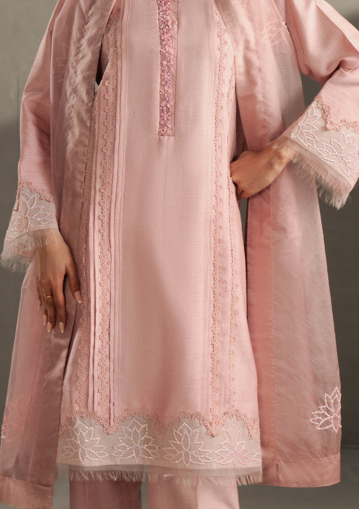 Introducing our latest collection, featuring a stunning ensemble that includes a powder pink silk kurta-style shirt adorned with a hand embellished neckline, laces and pleats, embellished with applique organza, sleeves accented with intricate sequins work. The shirt showcases exquisite stitching details, loops, and pleating details, the hem is beautifully finished with sequins work and laces. Paired with silk culottes featuring delicate embroidered appliquÃÂé work, this outfit is complemented by an organza dupatta with hand embellished sequins motifs, seamlessly transitioning into lace details.