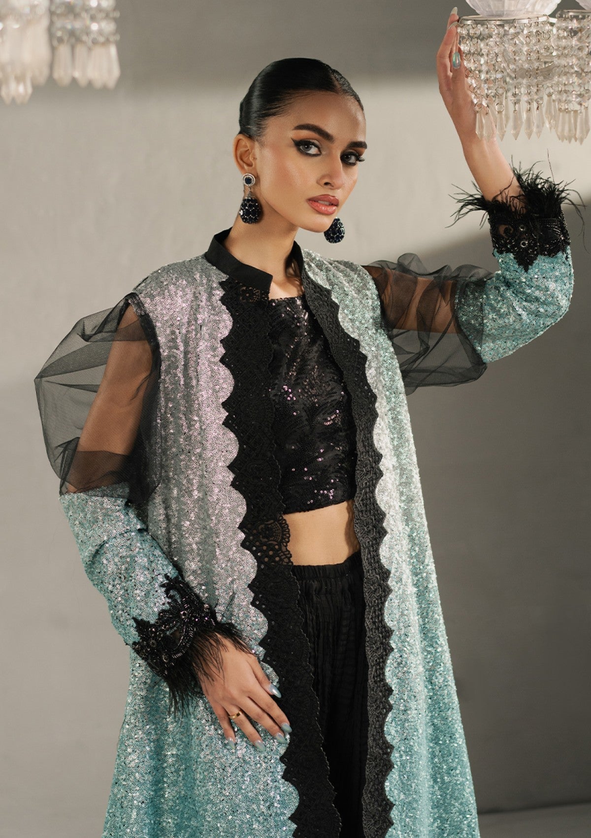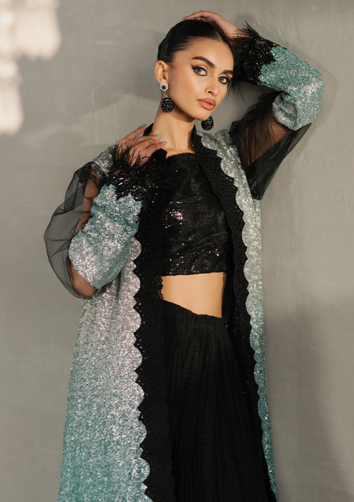Presenting "MEIRAâÃÂÃÂ- a universally flattering design that epitomizes sophistication. This metallic, ombrÃÂé shimmeryflowing, front-open jacket captures attention with its intricate craftsmanship and shimmering sequins that add a touch of allure, it is adorned with gleaming sequins that weave their enchanting spell across a sumptuous net canvas, while precious pearls accentuate the ensemble, creating a mesmerizing composition. Layered over exquisitely tailored crushed sharara pants, this glistening vision of beauty is perfect for making a lasting impression with its glamorous allure and timeless elegance.
