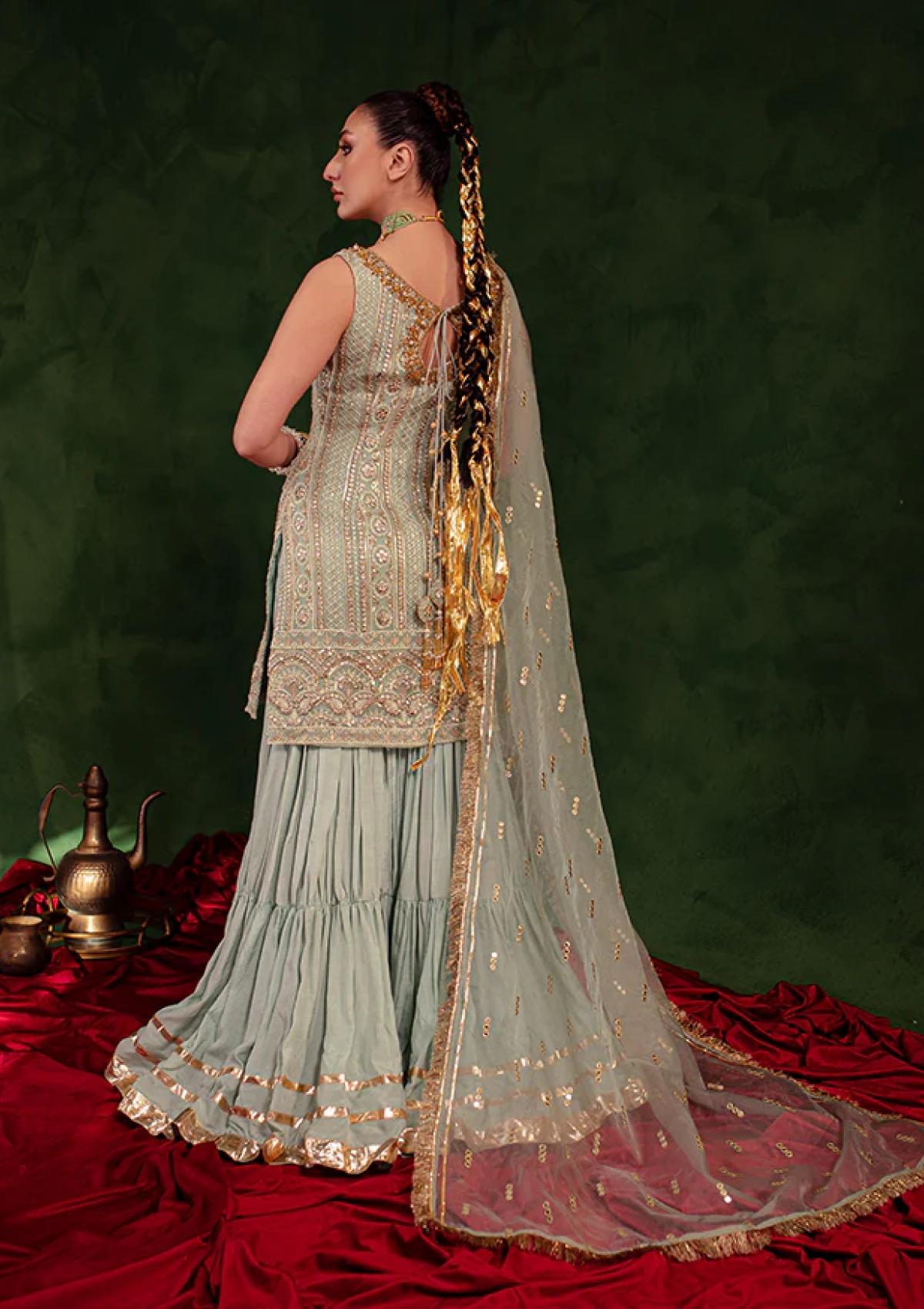 Beautifully stitched ferozi dress, Qayaas, includes details like embroidered chiffon with tilla, sequins, thread, and pani. You can be the center of attention with the Korean silk garara detailed with gotta work. The neckline of this shirt is embellished with mirror, dabka, tilla, and swarovski work. Give a finishing touch to your look by styling it with a dupatta detailed with pani work and gotta.