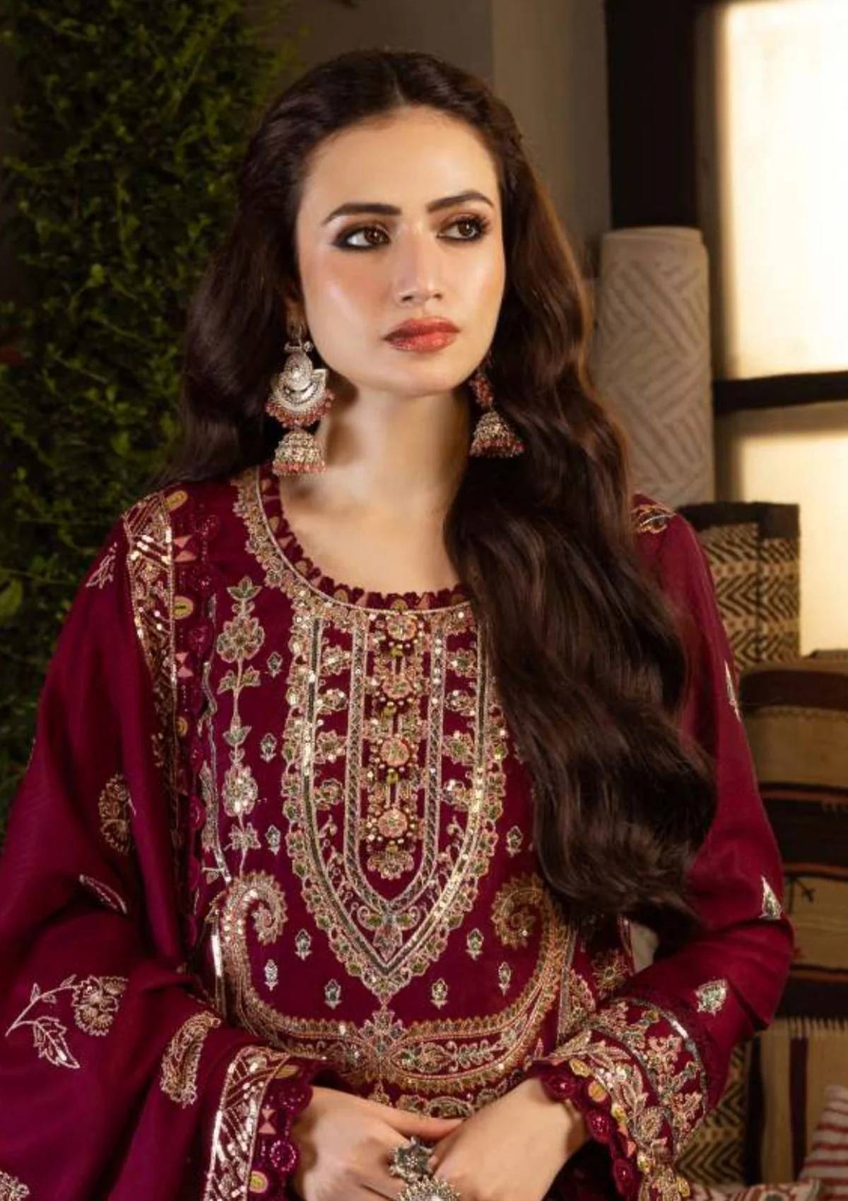 Embrace the tapestry-inspired Cherry Red Allure, this ensemble is a breathtaking piece that is brought to life with intricate embroidery in peach, pink, mint, and sea green threads, accented by light gold zari and sequins. The design pattern is a homage to Kashmiri tapestries and embroidered shawls, creating a visual narrative as vivid as the region itself. The embroidered front and back necklines serve as the prologue to a captivating story. The ensemble weaves a rich tapestry of tradition and artistry. The sleeves, adorned with embroidered sequins, add sophistication and depth to the ensemble. The intricately embroidered shawl, adorned with four side borders, wraps you in the cozy embrace of Kashmir's captivating charm.