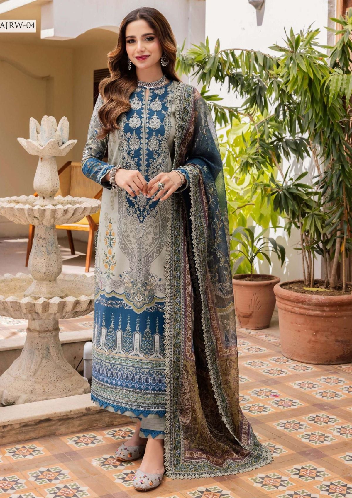 Emanate regal charm in our harbor gray ensemble adorned with captivating Mughal motifs. The embroidered neckline perfectly complements the intricate print of this ensemble, and the addition of a stunning zari-lined dupatta adds to its majestic allure.