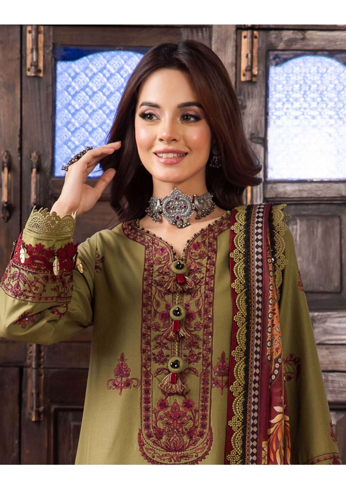 Elevate your style with this basil green ensemble featuring a maroon embroidered neckline and borders, including sleeves, which infuse classic ethnic charm into the design. The ensemble is perfectly complemented by a silk dupatta adorned with a stunning mix of motifs, making it a truly gorgeous and timeless piece.